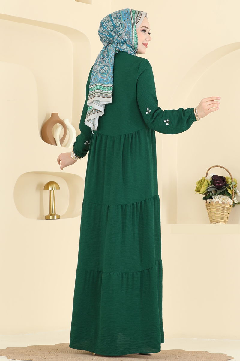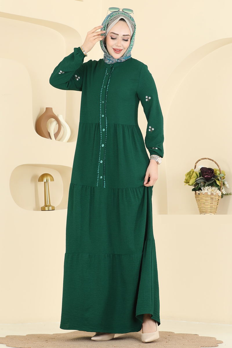 This elegant Embroidered Sleeve Aerobin Dress, with its hijab-friendly design, is comfortable to wear in all seasons. Washable at 30 degrees considering its delicate fabric, the dress offers both style and practicality. It's semi-mandarin collar and half-button front design add a modern touch, while the ruffled hem contributes a feminine flair. Adorned with intricate embroidery details, this chic piece enhances comfort with its elastic-cuffed sleeves. Its unlined structure ensures a light and comfortable fit. The product is modeled in a size 38.