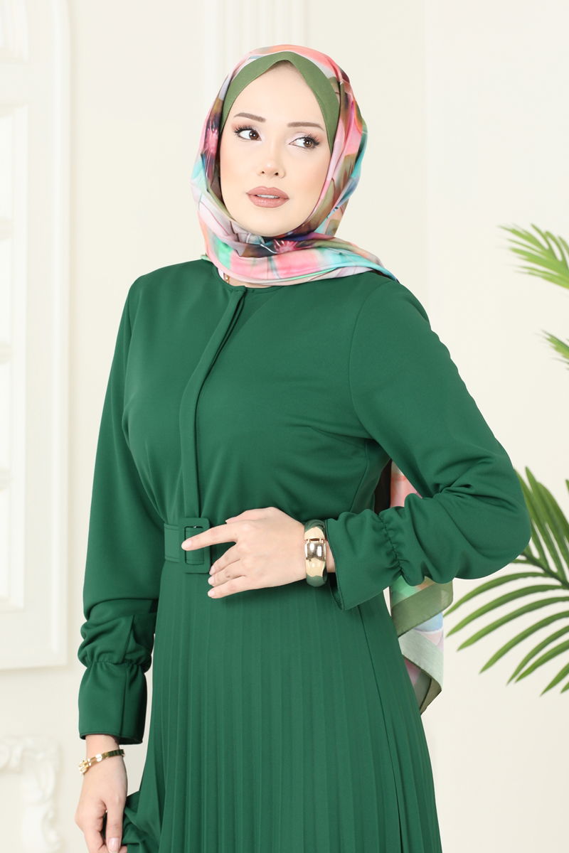 The Pleated Skirt Belted Dress; Manufactured from Scuba Crepe fabric and features a bicycle neck design that can be closed with hidden buttons. This elegant dress is washable at 30 degrees due to its delicate nature and offers a modern look with belt detail. Unlined and with elastic cuffs, this dress can be comfortably used in all four seasons. The product stands out with both stylish and functional details.