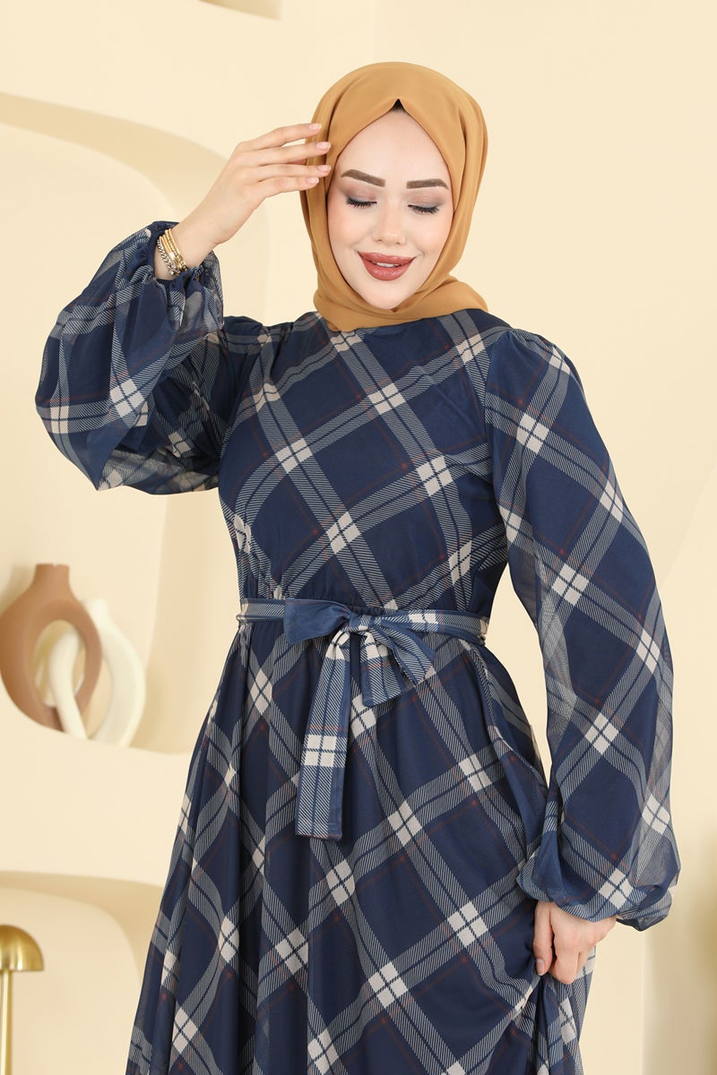 The Plaid Tulle Dress is designed specifically for individuals who adopt the modest clothing style. Usable across all seasons, this dress can be washed at 30 degrees on a gentle cycle. Made from tulle fabric, it features a crew neckline and is lined. The sample shown is size 38. It includes an elastic waistband and a functional button at the back. Ideal for various social activities and daily wear.
