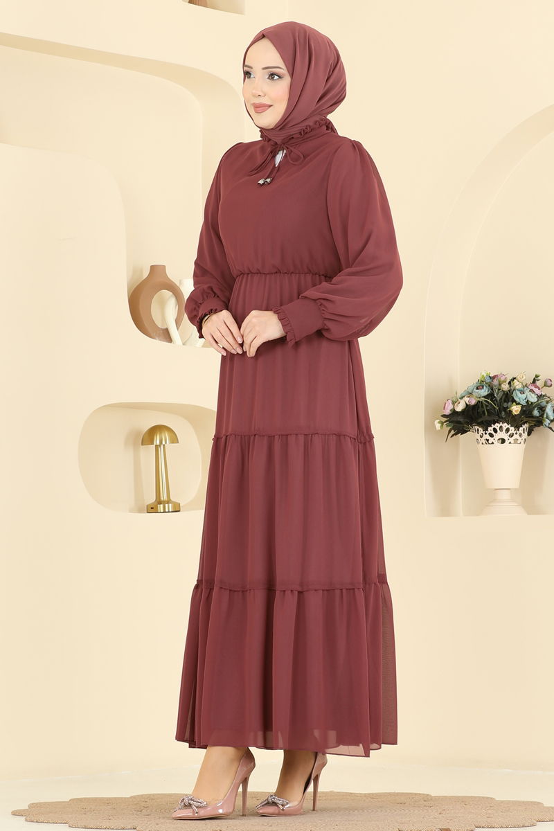 The Neck Tie Chiffon Dress offers both elegance and comfort in one. Suitable for wear in all seasons with its modest design, this chiffon dress can be washed on a gentle cycle at 30 degrees Celsius. Featuring a semi-mandarin collar and a flexible lining, it prioritizes comfort. The elastic waist and tie details add a touch of elegance, while the active buttons on the cuffs ensure practical use. The product shown on the model is a size 38.