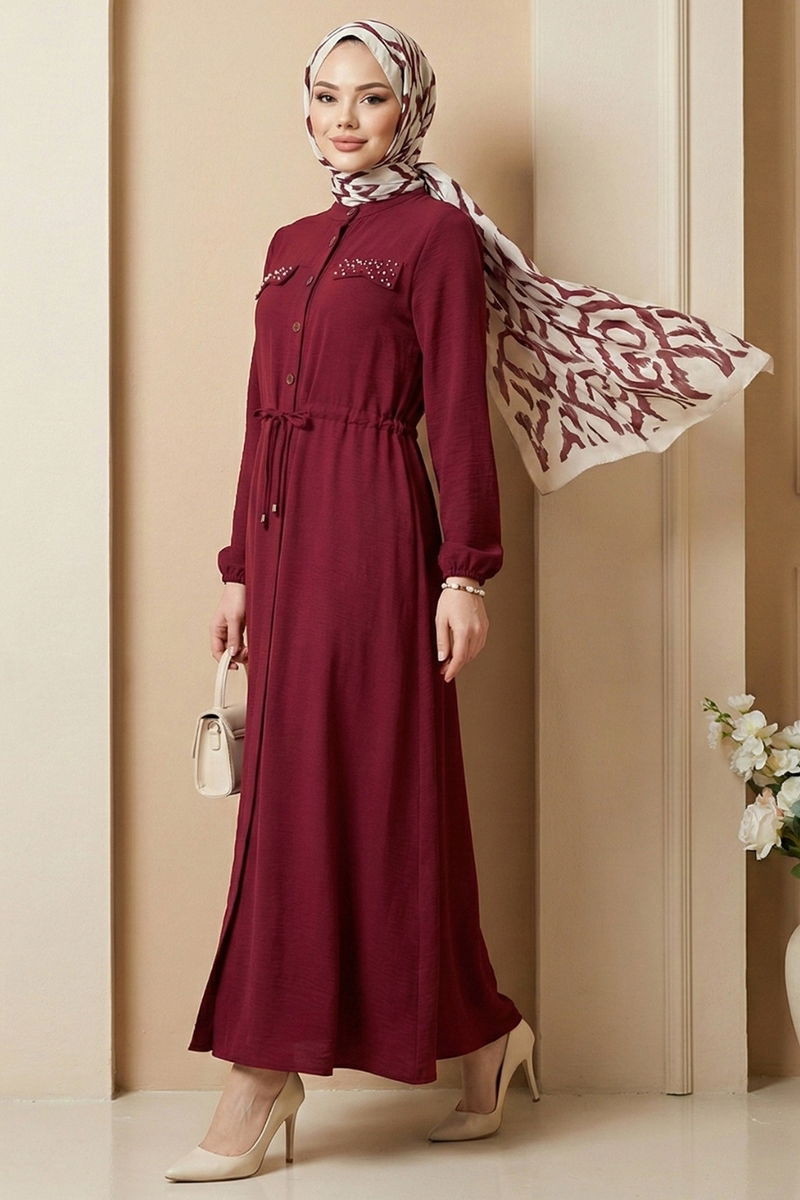 The Stone Detailed Aerobin Dress stands out with its elegant and modern design, offering both style and comfort in modest fashion. Suitable for all seasons, this dress made from special aerobin fabric ensures comfort throughout the day. Its high collar and front-button design make it practical to wear, while the unlined structure and elastic cuffs provide freedom of movement. The tie-waist design adds a charming touch. Recommended to be washed at 30 degrees with gentle care, this dress is set to become a staple in your wardrobe.