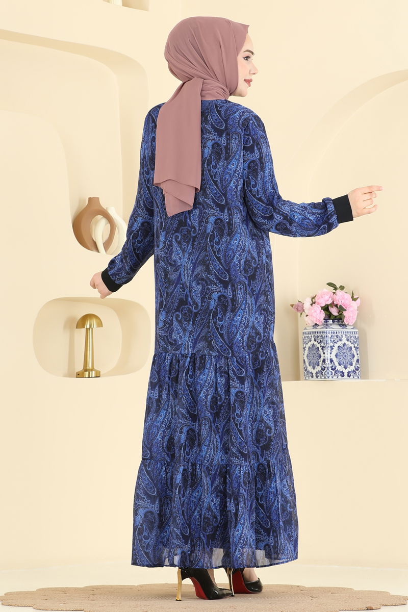 Product Name: Printed Chiffon Dress. This elegant modest dress is designed to be comfortably worn in all seasons. The dress, which should only be dry cleaned, is made of chiffon fabric, features a crew neck and has a flexible lining. It stands out with its print details. The product on the model is size 38.