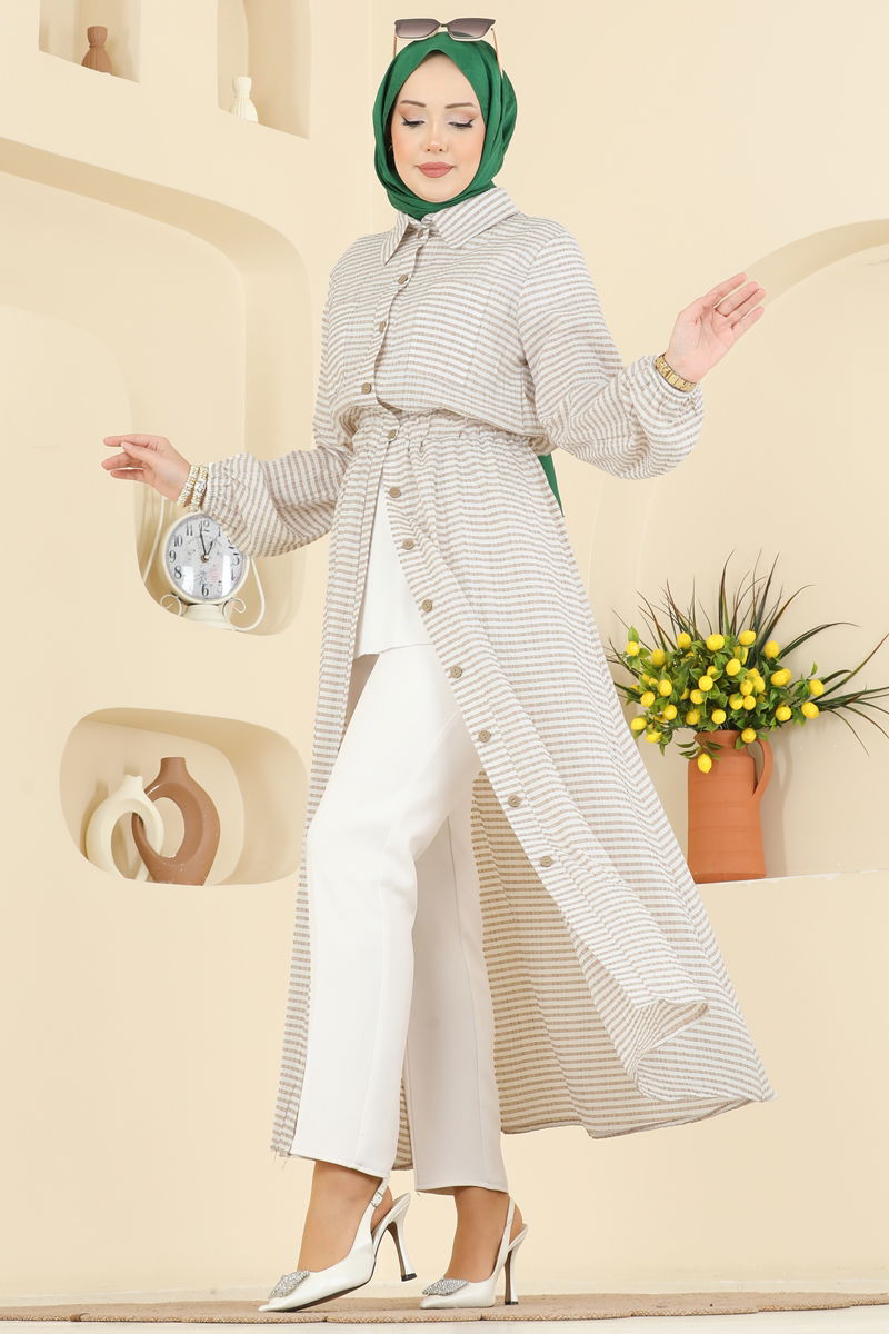 The Striped Elastic Waist Dress, with its stylish and comfortable design, will become a staple in your modest wear wardrobe for all seasons. Made from crepe fabric, this dress can be delicately washed at 30 degrees. It features a shirt collar and front buttons for a contemporary look, while its unlined design and elastic cuffed sleeves prioritize comfort. Practical side pockets add functionality.