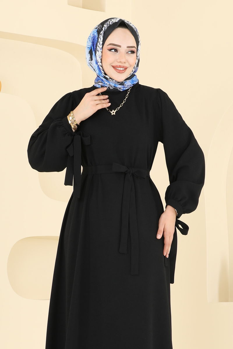 Discover the unique Lace-up Cuff Hijab Dress, designed for year-round comfort. This dress can be washed at 30 degrees with gentle care and is made from durable crepe fabric. It features a crew neck and a zipper at the back, adding a modern touch. The unlined design ensures a light and comfortable wear. The included belt, which can be used optionally, completes your elegant look. With its lace-up cuffs, this dress offers a sophisticated appearance that fits every size and style.