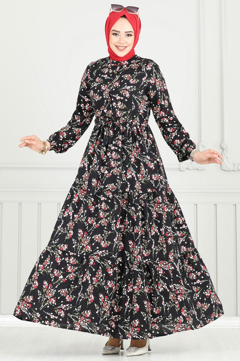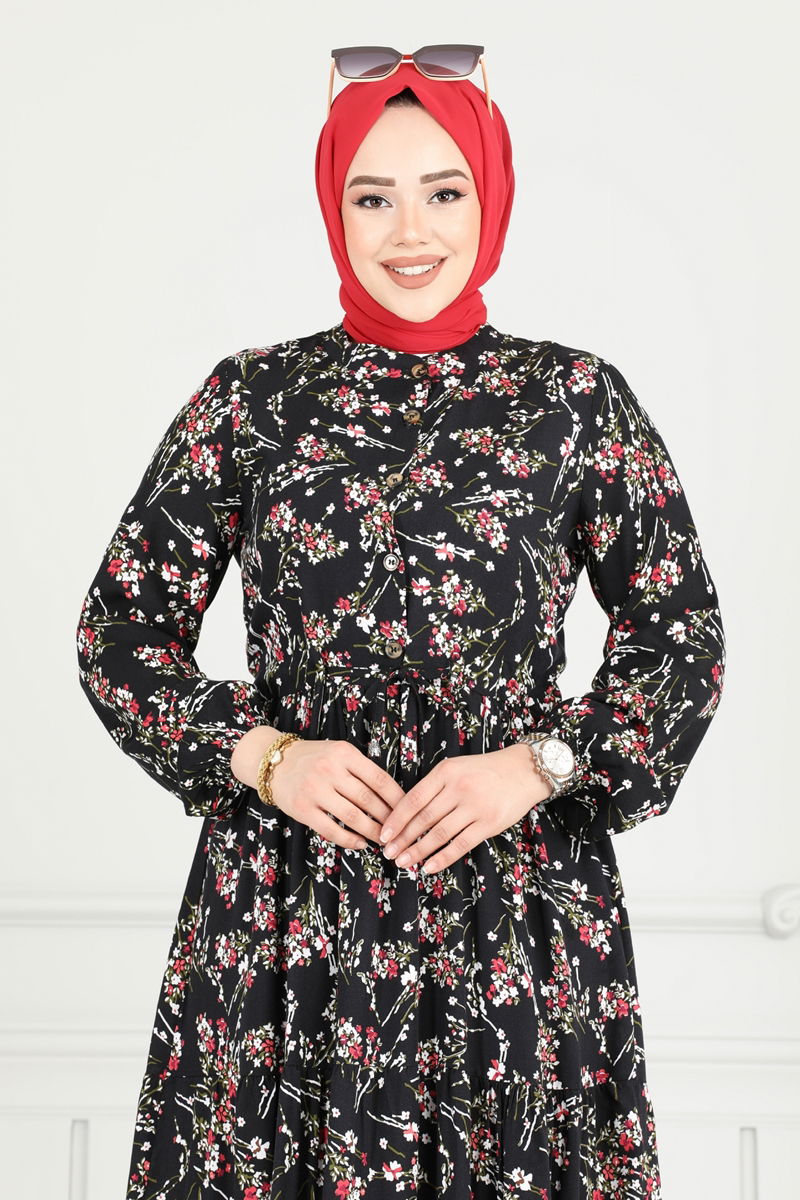 The Floral Pattern Hijab Dress is an innovative and stylish choice that can be comfortably worn in all seasons. Featuring a bike collar detail, this dress offers practicality with its front half buttons. The soft texture of the viscose fabric ensures comfort throughout the day, while hand washing provides durability. With a tie waist and elastic cuffs, this model is both chic and functional.