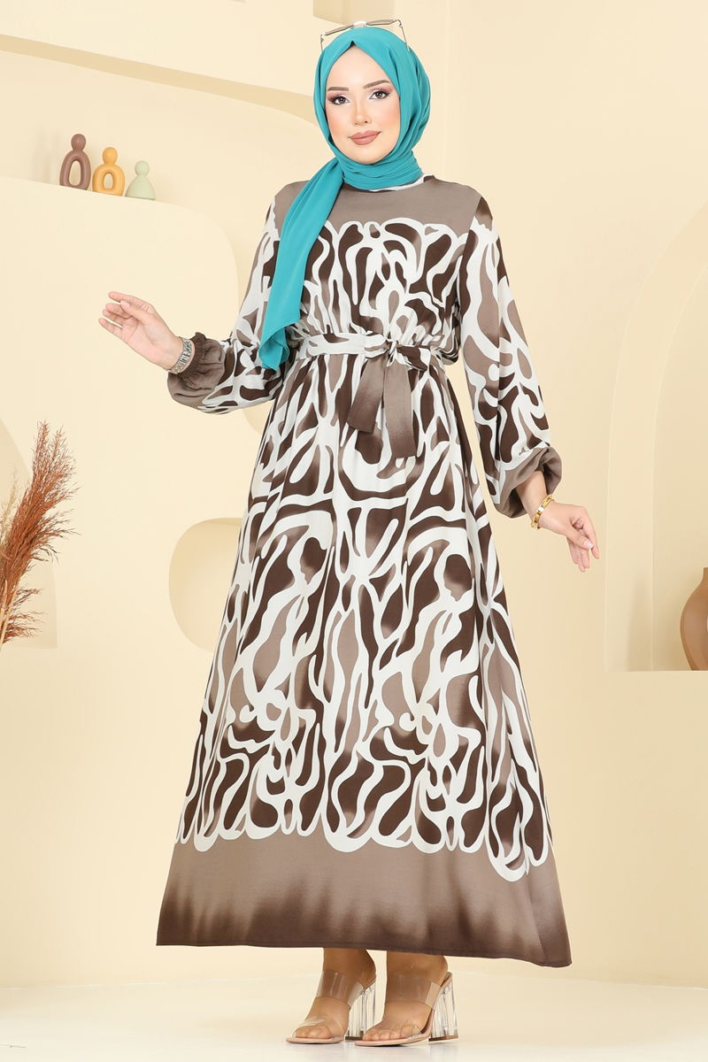 The Patterned Elastic Waist Dress is an elegant modest wear suitable for all seasons. Made from viscose fabric, this dress offers both comfort and style. Its bike neck and buttoned back design are eye-catching, while its unlined structure provides a light and comfortable experience. The dress should be hand washed and is worn over the head. It has a length of 165 cm, chest circumference of 80 cm, waist size of 68 cm, and hips of 96 cm. The model features elastic cuffs and a belt with stitched ends to prevent waving, which adds elegance and can be optionally removed.