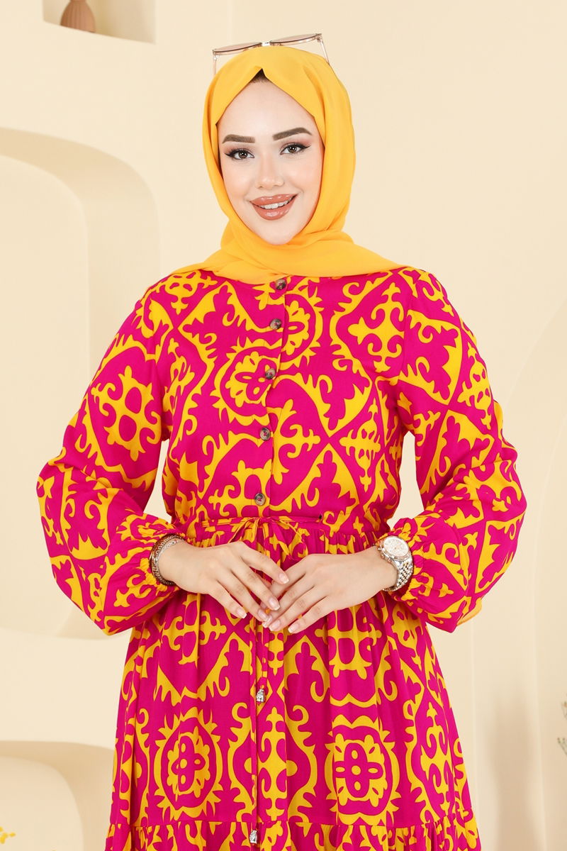 Introducing our stylish Patterned Dress, suitable for all seasons. Made from carefully chosen viscose fabric, this dress offers both style and comfort. The half high collar and front half button details allow for practical wear, while the lining-free design keeps it light and airy. Elastic cuffs add a modern twist to the dress, which is best maintained through hand washing. Its drawstring waist adjusts to fit your body shape, enhancing your elegance.