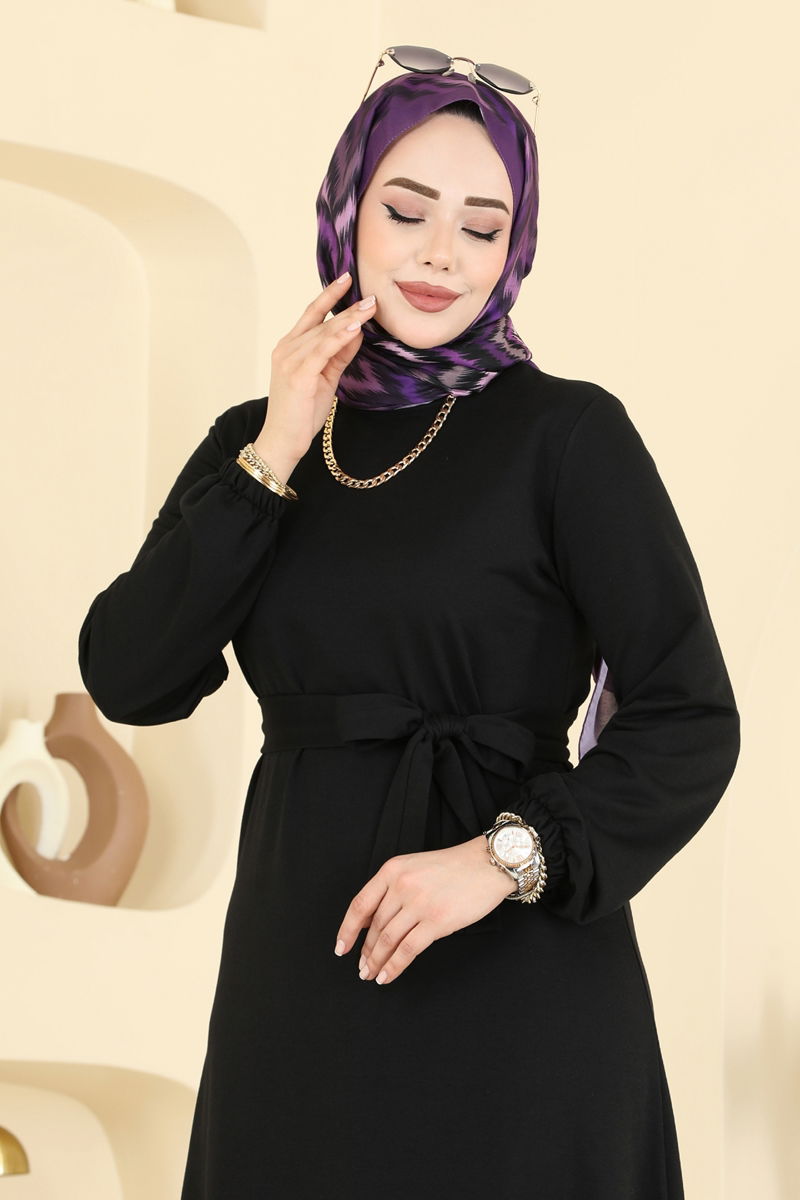 Elegant and stylish, the Belted Ruffle Detail Dress is ideal for all-season wear. Made from a soft dual-thread fabric, this modest dress features a bike-neck design and elasticated cuffs for comfort. The front-tie belt offers a feminine silhouette, while the ruffled skirt provides freedom of movement. The dress is unlined for light wear and can be gently washed at 30 degrees. The product model wears size 38 as a reference.