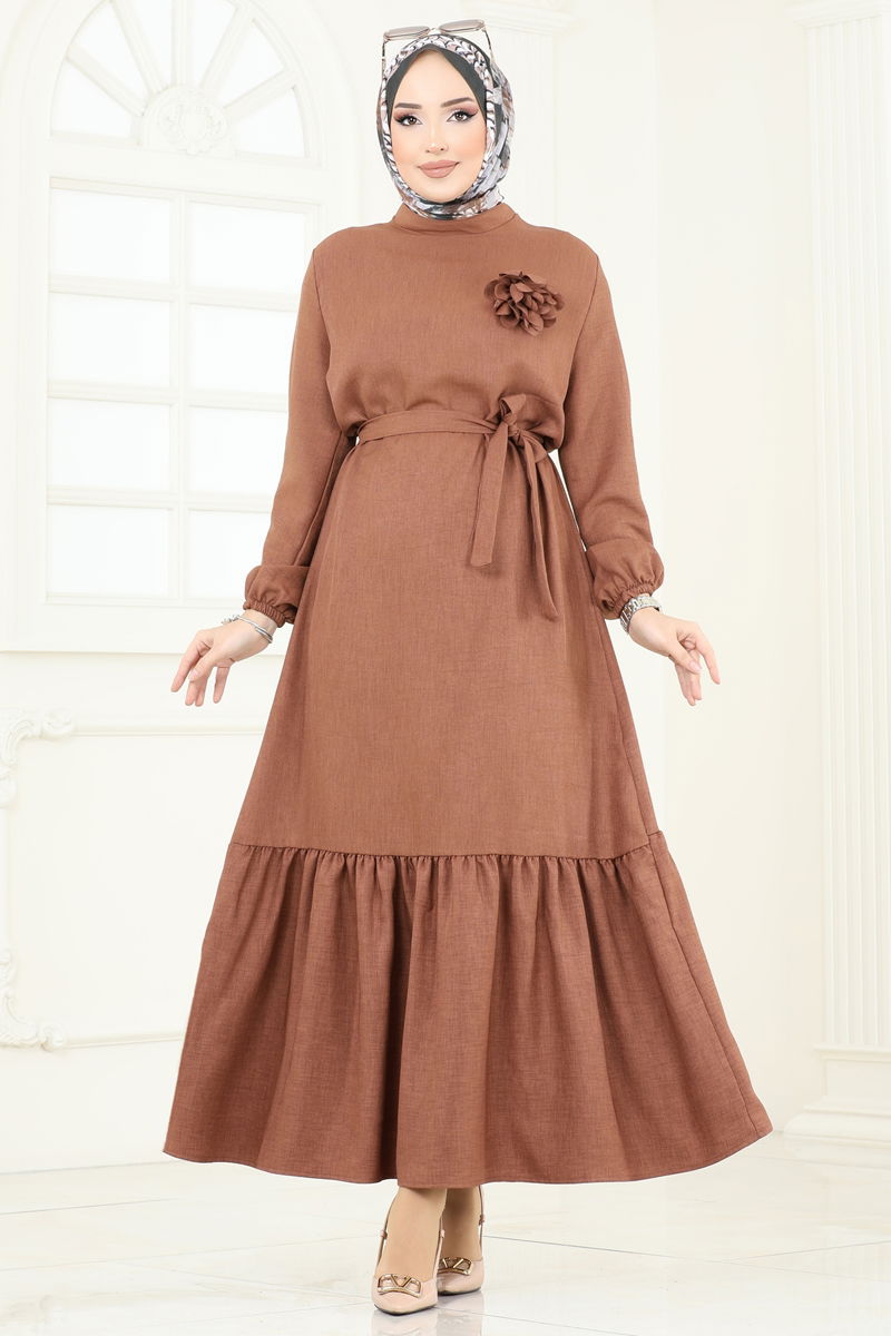 Crafted from Sofia Linen, the Rose Detail Linen Dress is specifically designed for modest wear. Suitable for all seasons, this dress can be cleaned with a gentle 30-degree wash. It features a mandarin collar and a zipper at the back, offering a chic and contemporary look. The unlined dress comes with a belt and brooch, both of which can be optionally removed. The belt is designed with stitched ends to prevent waviness, enhancing the overall design.