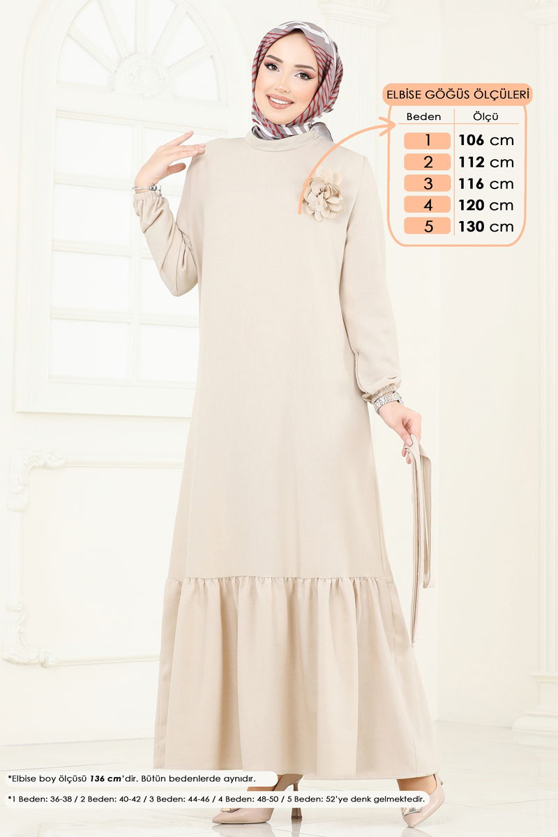 Crafted from Sofia Linen, the Rose Detail Linen Dress is specifically designed for modest wear. Suitable for all seasons, this dress can be cleaned with a gentle 30-degree wash. It features a mandarin collar and a zipper at the back, offering a chic and contemporary look. The unlined dress comes with a belt and brooch, both of which can be optionally removed. The belt is designed with stitched ends to prevent waviness, enhancing the overall design.