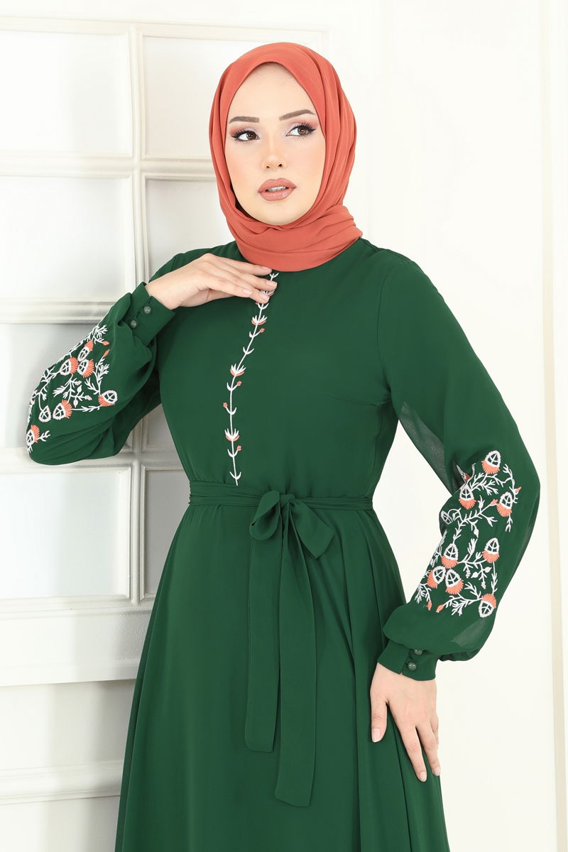The Embroidered Chiffon Dress combines elegance and comfort, making it an ideal choice for modest attire throughout the seasons. Noteworthy for its delicate and sophisticated details, this dress can be cleaned with a gentle wash at 30 degrees Celsius. Its soft chiffon fabric and mandarin collar design offer an elegant appearance, while its lined structure increases comfort. This model, which features a zipper at the back, dazzles with its embroidery details. The included belt adds to its elegance, helping it maintain shape, while the functional cuff buttons stand out as a practical feature.