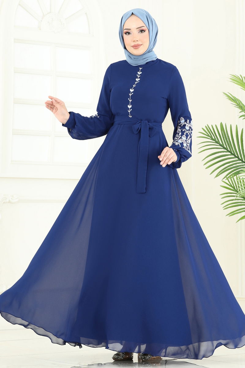 The Embroidered Chiffon Dress combines elegance and comfort, making it an ideal choice for modest attire throughout the seasons. Noteworthy for its delicate and sophisticated details, this dress can be cleaned with a gentle wash at 30 degrees Celsius. Its soft chiffon fabric and mandarin collar design offer an elegant appearance, while its lined structure increases comfort. This model, which features a zipper at the back, dazzles with its embroidery details. The included belt adds to its elegance, helping it maintain shape, while the functional cuff buttons stand out as a practical feature.