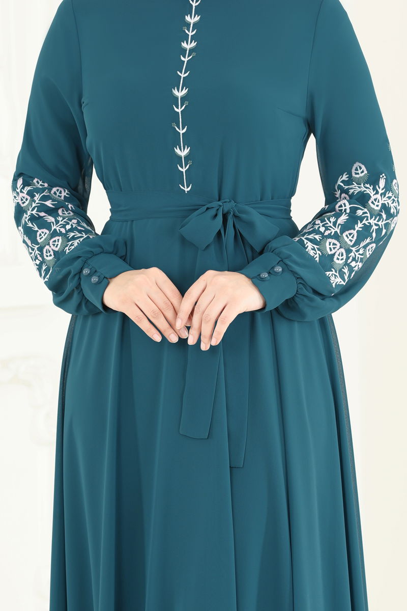 The Embroidered Chiffon Dress combines elegance and comfort, making it an ideal choice for modest attire throughout the seasons. Noteworthy for its delicate and sophisticated details, this dress can be cleaned with a gentle wash at 30 degrees Celsius. Its soft chiffon fabric and mandarin collar design offer an elegant appearance, while its lined structure increases comfort. This model, which features a zipper at the back, dazzles with its embroidery details. The included belt adds to its elegance, helping it maintain shape, while the functional cuff buttons stand out as a practical feature.