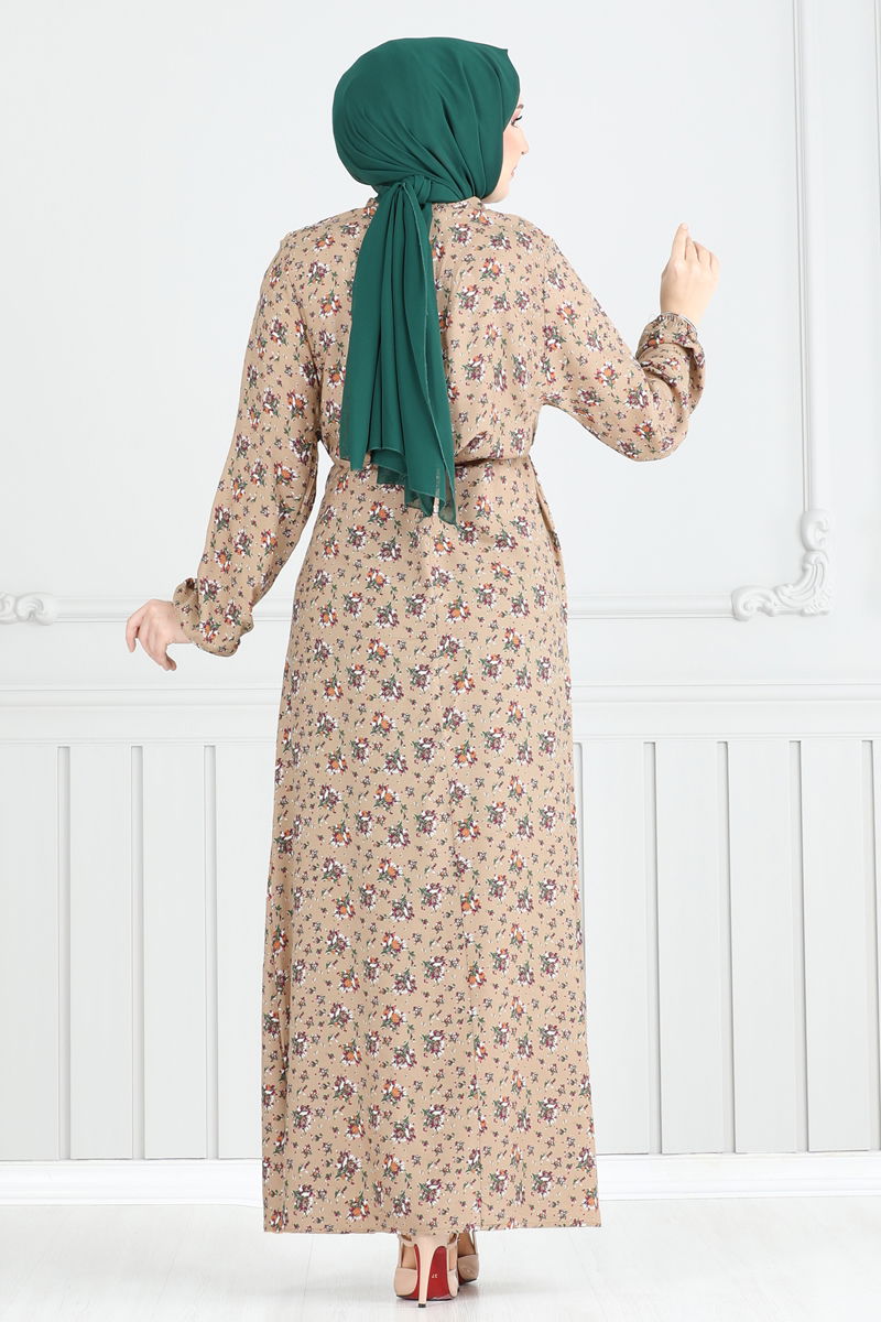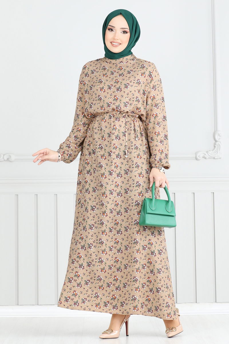 This floral-patterned modest dress catches the eye with its elegant design and can be comfortably worn in all seasons. Requiring hand wash, this special design is made of viscose fabric and offers comfortable wear. The dress, featuring a zipper at the back and elastic cuffs, has a stand-up collar. It is light and practical due to its lining-free structure. The dress also comes with a belt that matches the outfit; the belt is designed with sewn ends while the middle part is left unstitched for flexibility. The belt can be used optionally or removed. The product displayed on the model is size 1, and the model's measurements are as follows: Height: 165 cm, Chest: 80 cm, Waist: 68 cm, Hips: 96 cm, Weight: 54 kg.