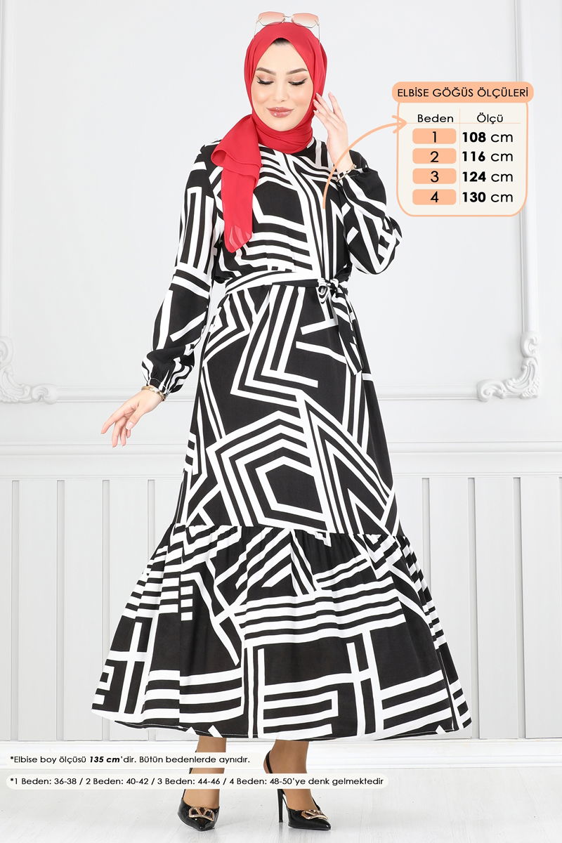 This stylish geometric patterned viscose dress can comfortably be worn all year round. It is recommended to be hand washed. Featuring a half mandarin collar and a lining-free design, it offers a modern look. The back zipper detail allows for practical use. The belt, designed to prevent waviness, is specially sewn and can be optionally removed. The elasticated cuffs make this a modest fashion product that combines elegance with comfort.