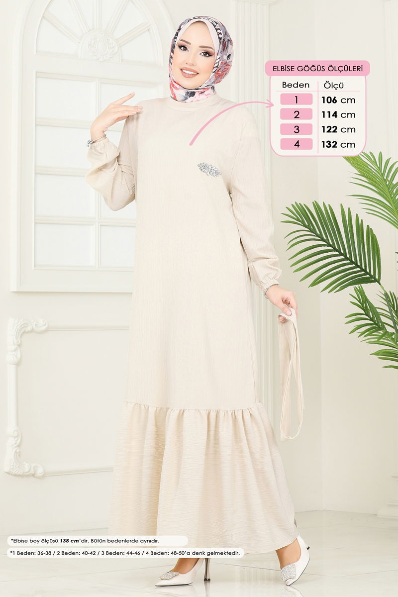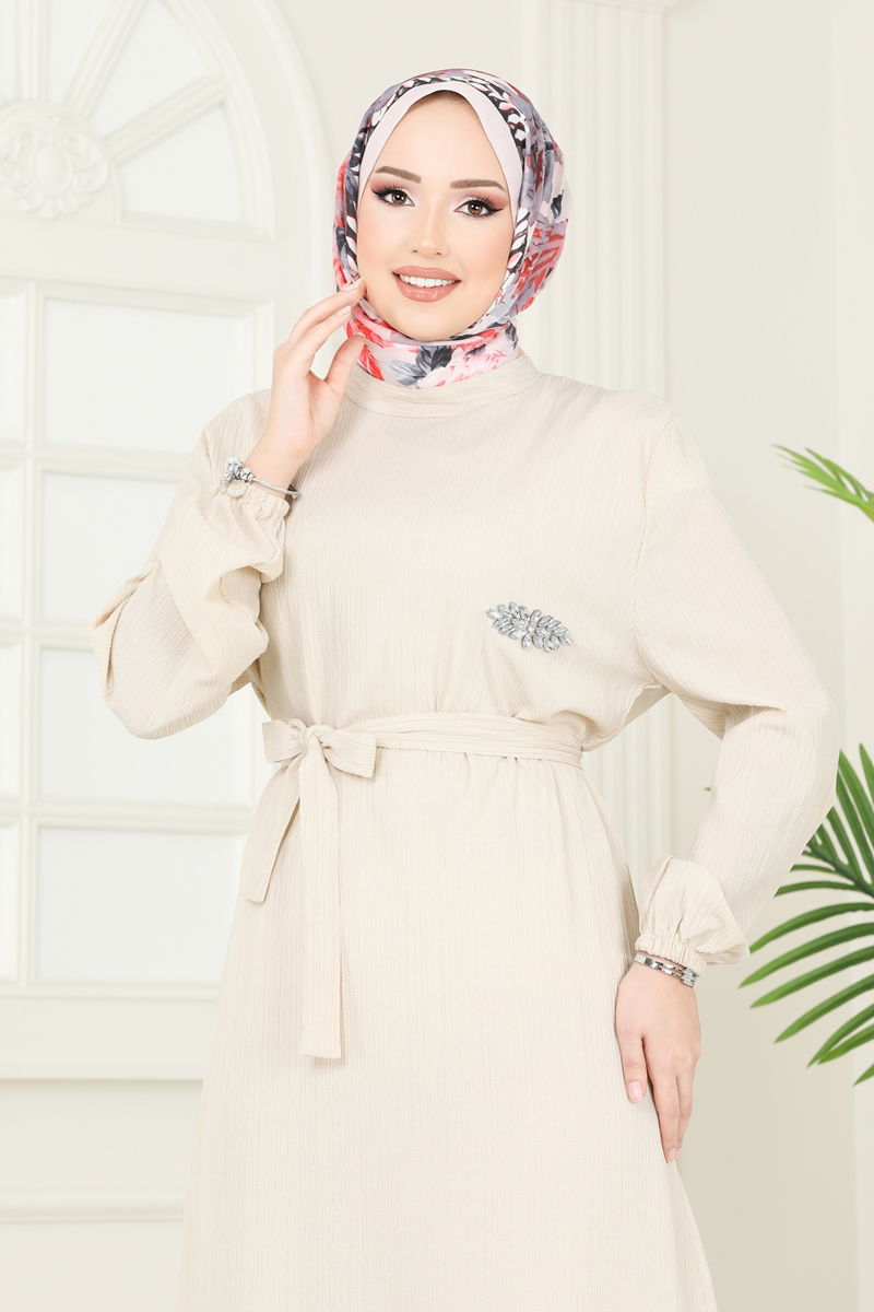 Combining elegance and comfort, the Stone Detailed Hijab Dress is a versatile option suitable for all seasons. This dress, which can be washed at 30 degrees due to its delicate nature, is durable and long-lasting because of its tree bark fabric. Offering a modern look with its semi Mandarin collar design, the dress is unlined and comes with a back zipper. Special sewing details and elastic cuffs enhance comfort, while the included optional belt adds a refined touch to your style.