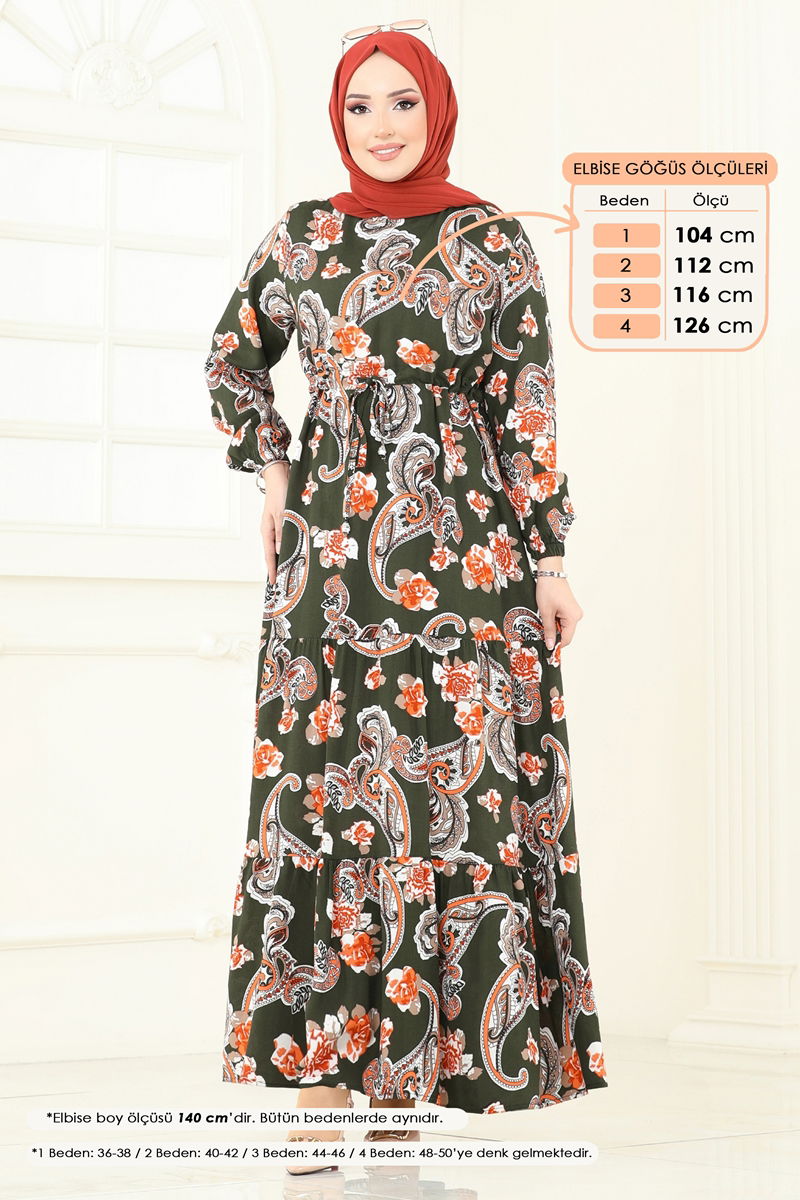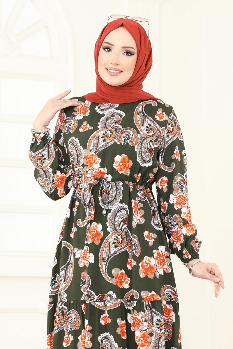 Ethnic Patterned Viscose Dress is a hijab style suitable for all-season use. Made from soft viscose fabric, it features a bike neck design and a zipper at the back for comfortable wear. Its drawstring waist ensures a perfect fit while the elastic cuffs add both style and practicality. Hand washing is recommended.