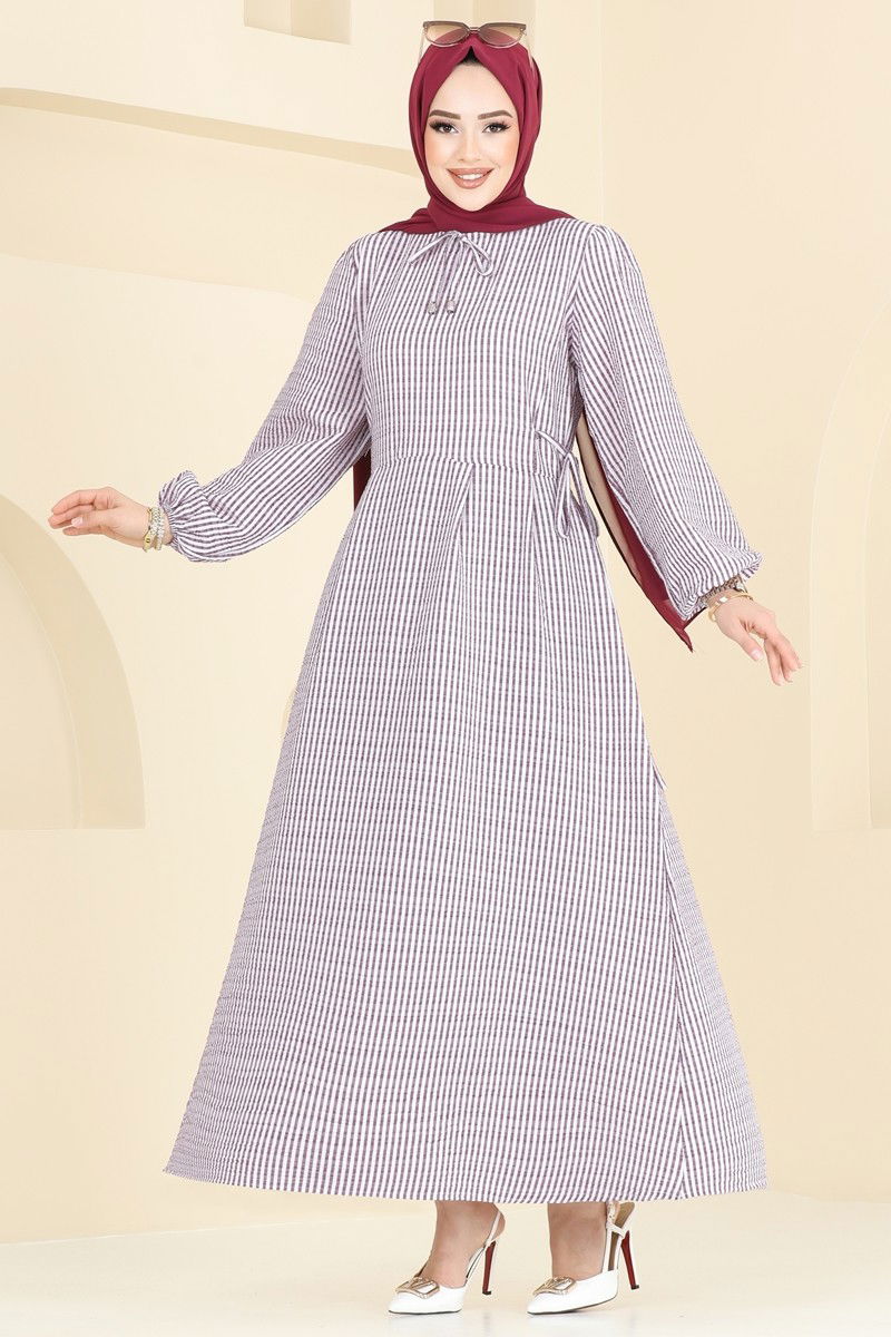 The Drawstring Neck Striped Dress is a specially designed modest wear model. This dress can be comfortably worn in all seasons and can be cleaned with a gentle wash at 30 degrees Celsius. Made from crepe fabric, this chic dress features a crew neck and is without lining. Its zipper at the back makes it easy to wear and remove. The design includes drawstrings and elastic cuffs, offering a modern and comfortable wear. Measurements of the model: Height: 165 cm, Chest: 88 cm, Waist: 68 cm, Hips: 99 cm, Weight: 56 kg.