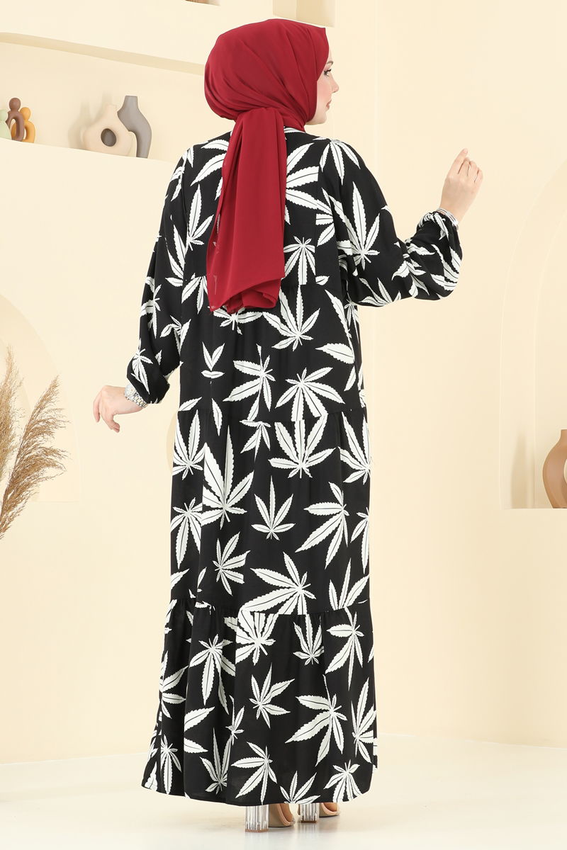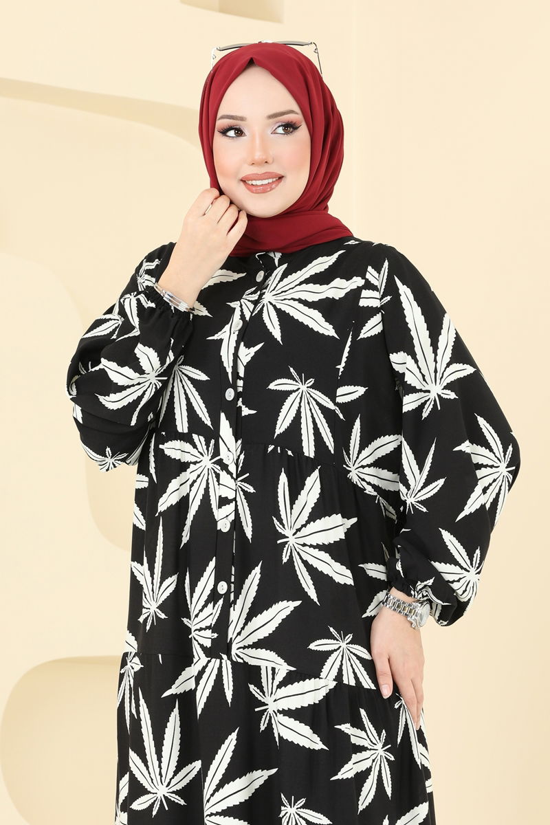Leaf Pattern Viscose Dress; is a modest wear model that can be comfortably used in all seasons. Made from viscose fabric, it offers a light and comfortable structure. It is recommended to be washed by hand. Half Mandarin collar and half button details on the front provide a modern and practical look. Its lining-free design and elasticated cuffs allow comfort throughout the day.