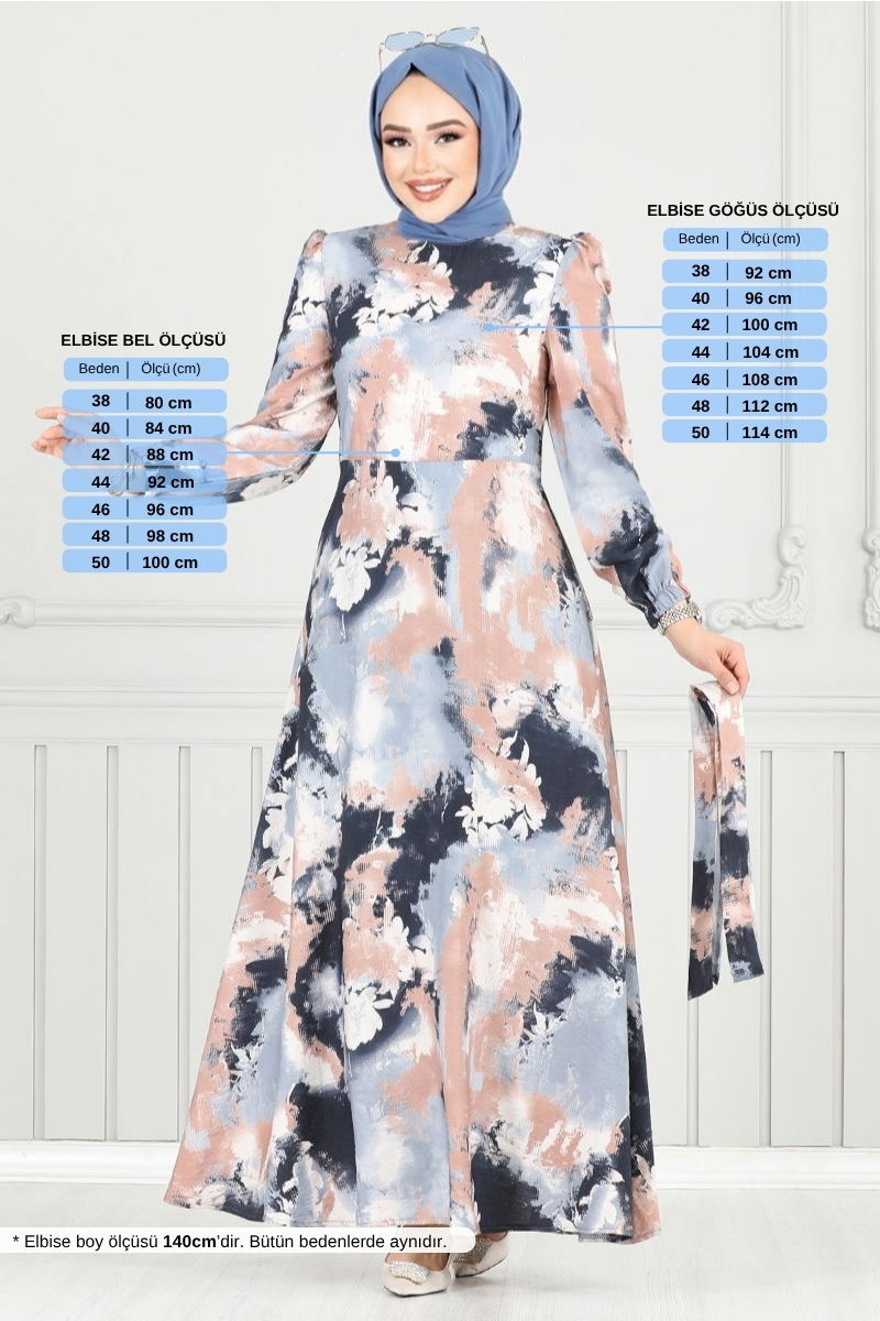 This elegant elastic-cuffed dress is an excellent choice for women who embrace modern modest fashion. Suitable for all seasons, this dress is made from modal fabric, offering a gentle touch to the skin. It features a crew neckline, an unlined design, and a back zipper, providing both style and practicality. The belt detail accentuates the waist, enhancing a feminine silhouette. The belt is designed to maintain its shape with stitched ends, while the middle is left unstitch for comfort. The belt is coordinated with the dress and can be optionally removed. The dress can be washed at 30 degrees on a delicate cycle, making it ideal for long-term use.
