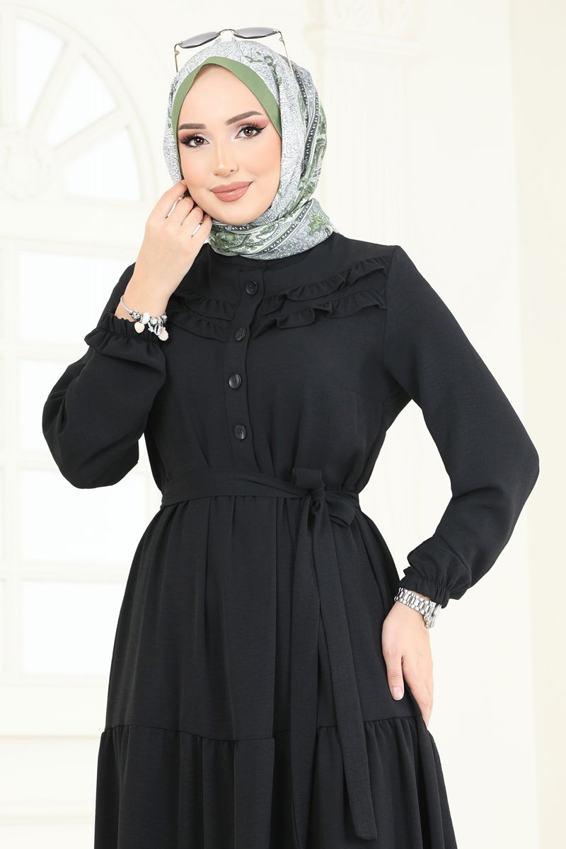 The Ruffle-Detailed Aerobin Dress is a modest wear design suitable for all seasons. This comfortable dress can be machine washed gently at 30 degrees. Made from Aerobin fabric, it features a semi-mandarin collar and half-button front. The dress is unlined and designed in a standard size 38. The belt is stitched at the ends to prevent waving, making its use optional.