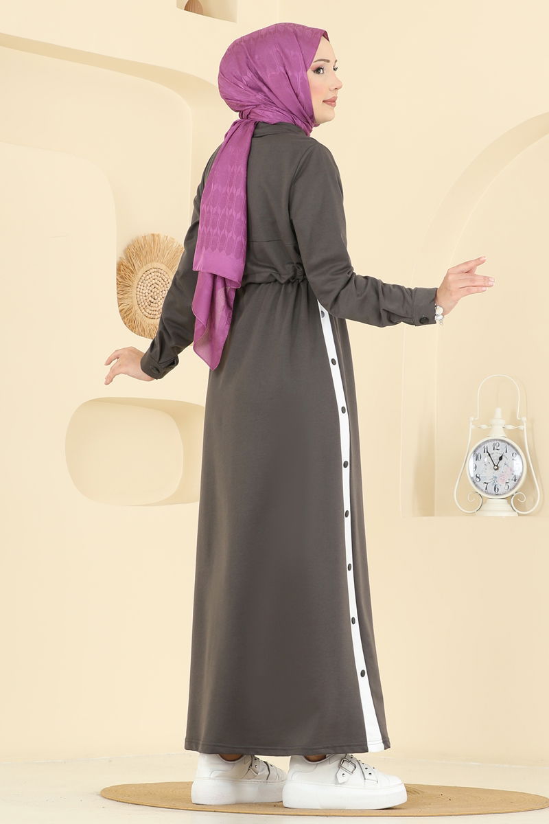 The Half-Buttoned Front Dress is designed for modest wear, suitable for all seasons. Crafted from durable double-thread fabric, this stylish piece features a shirt collar and half-button front closure, ensuring coverage as it is unlined. Displayed in a size 38 sample, it includes an adjustable drawstring waist, offering customizable comfort.