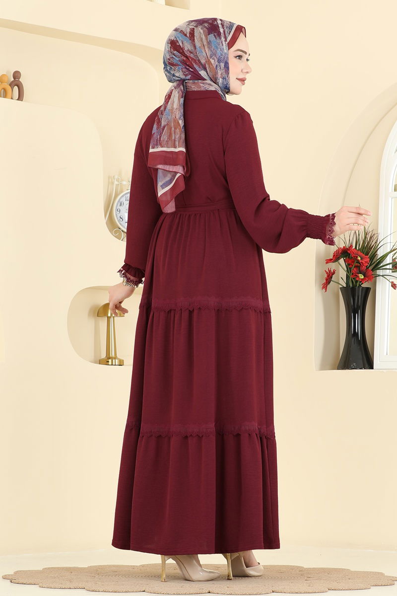 The Lace-Detailed Belted Dress brings a fresh breath to modest fashion, combining ease and elegance. Suitable for all seasons, this dress is made from special aerobin fabric, ensuring comfort. It can be washed at 30 degrees on a delicate cycle. The semi-mandarin collar design and half-button details on the front accentuate its style, while the lace details enhance its femininity. The included belt, which can be optionally omitted, is adaptable to various styles. This elegant piece, with its elasticated cuffs and lacking any belt loops, blends classic and modern elements seamlessly.
