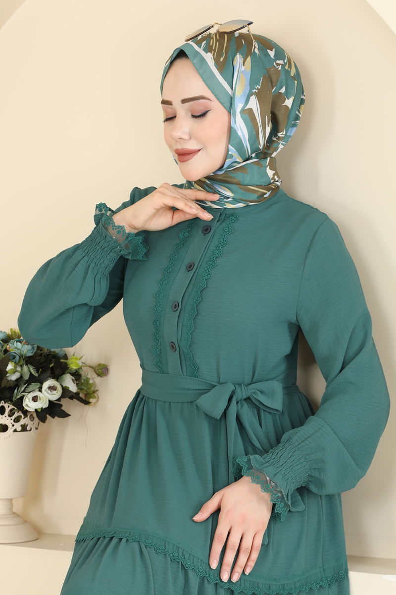 The Lace-Detailed Belted Dress brings a fresh breath to modest fashion, combining ease and elegance. Suitable for all seasons, this dress is made from special aerobin fabric, ensuring comfort. It can be washed at 30 degrees on a delicate cycle. The semi-mandarin collar design and half-button details on the front accentuate its style, while the lace details enhance its femininity. The included belt, which can be optionally omitted, is adaptable to various styles. This elegant piece, with its elasticated cuffs and lacking any belt loops, blends classic and modern elements seamlessly.