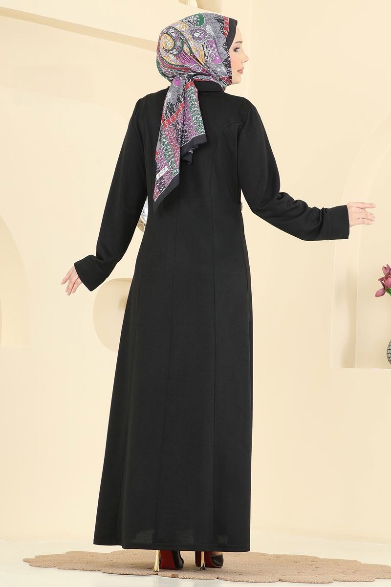 The Belt Buckle Detailed Dress is a stylish option suitable for modest wear, perfect for all seasons. Made from dual-thread fabric, this model features a shirt collar design that enhances your elegance. The integrated buckle detail offers a unique look, while the front zipper makes it easy to wear. It can be washed at 30 degrees with a gentle cycle and its lining-free structure keeps it lightweight. The product displayed is in size 38.
