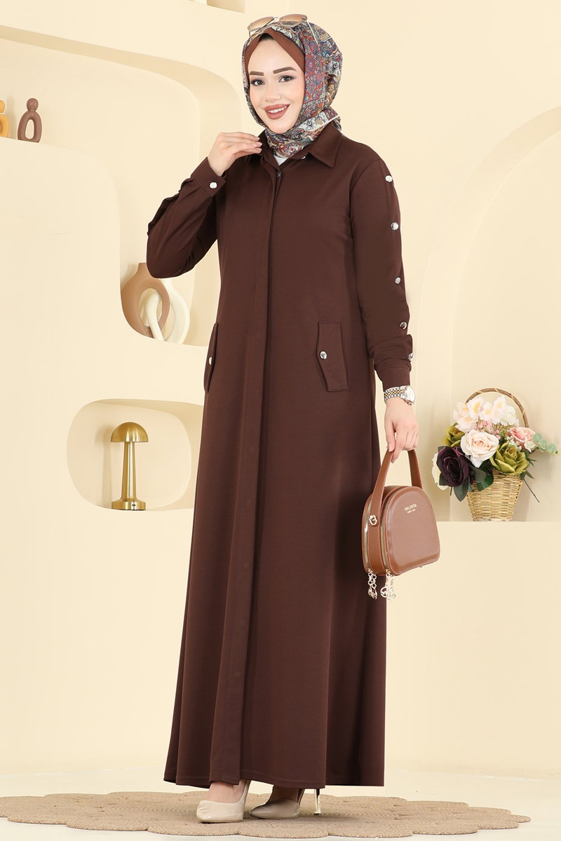 Düğme Aksesuarlı Örme Krep Ferace 24014UKB139-MS Kahve