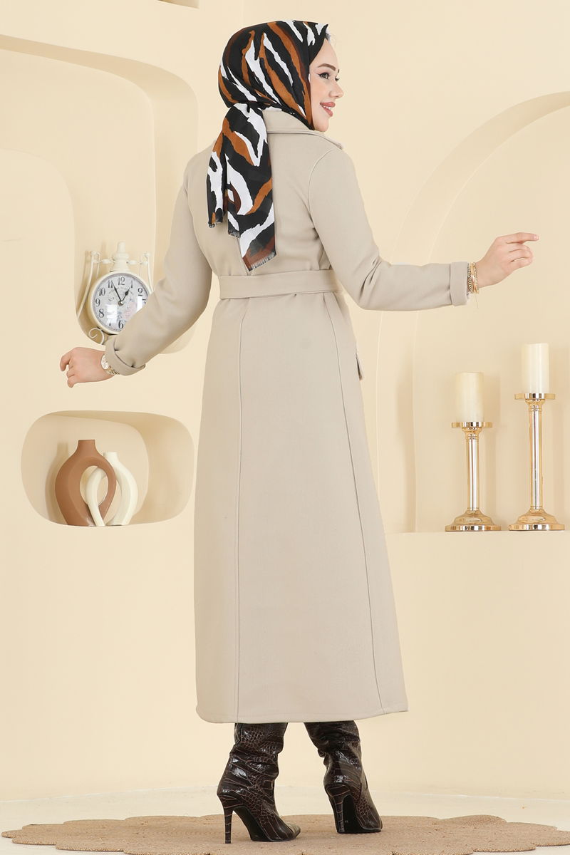 Detaylı Düğmeli Taş Rengi Kaşe Kaban