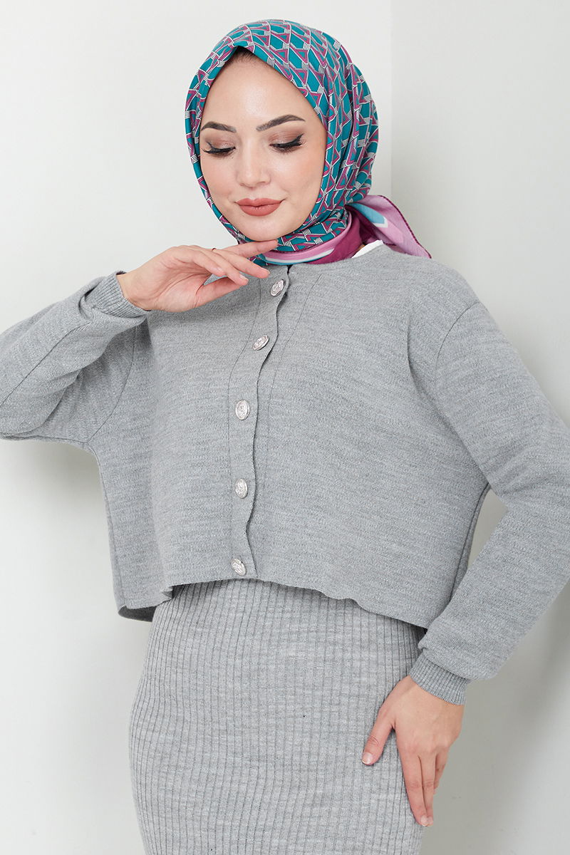 Button Detail Suit GriKombine Products Including : Blouse and dress. Fabric Feature: It is made of first-class Knitwear fabric. It can be used in Autumn and Winter season. Product Feature: New season hijab is a fashion product. The product is a bicycle collar. The product is buttoned from the front. It is unlined.. There may be a tonal difference in the product due to concept photo shoots. Washing : It should be washed at 30 degrees without squeezing. (The product on the model is the standard size.) The button is a Detailed Tool model hijab product. It can be used in Autumn and Winter season. it should be washed at 30 degrees without squeezing. It is made of premium knitwear fabric. The product is a bicycle collar. The product is buttoned from the front. It is unlined. (The product on the model is the standard size.)Weight (Kg):0.49