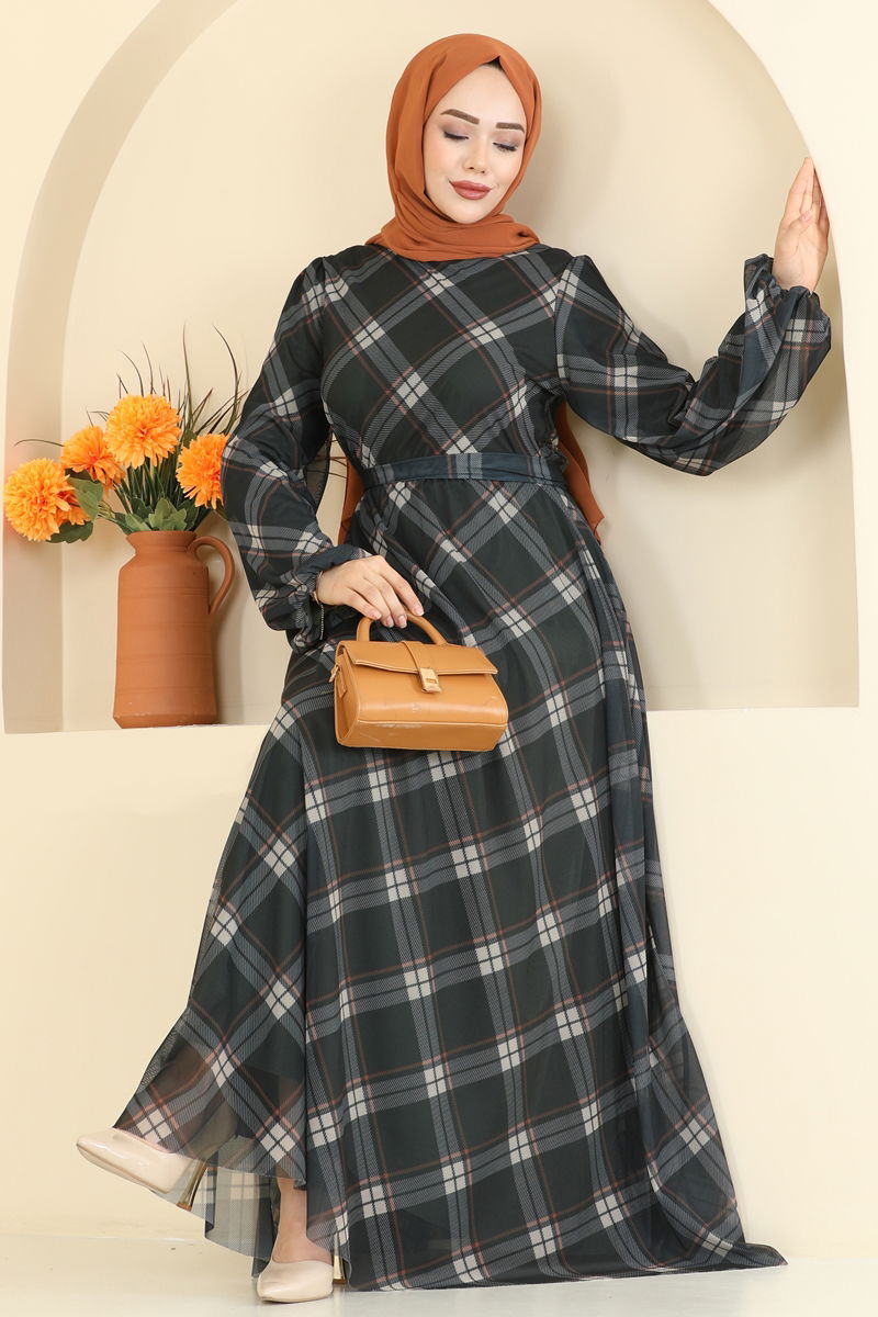 Ekose Desenli Tül Elbise 5740EDF311-MS Haki