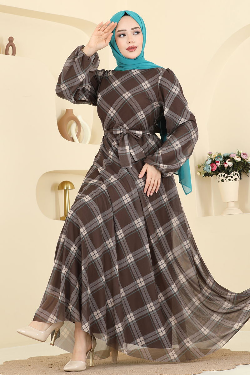 Ekose Desenli Tül Elbise 5740EDF311-MS Kahve