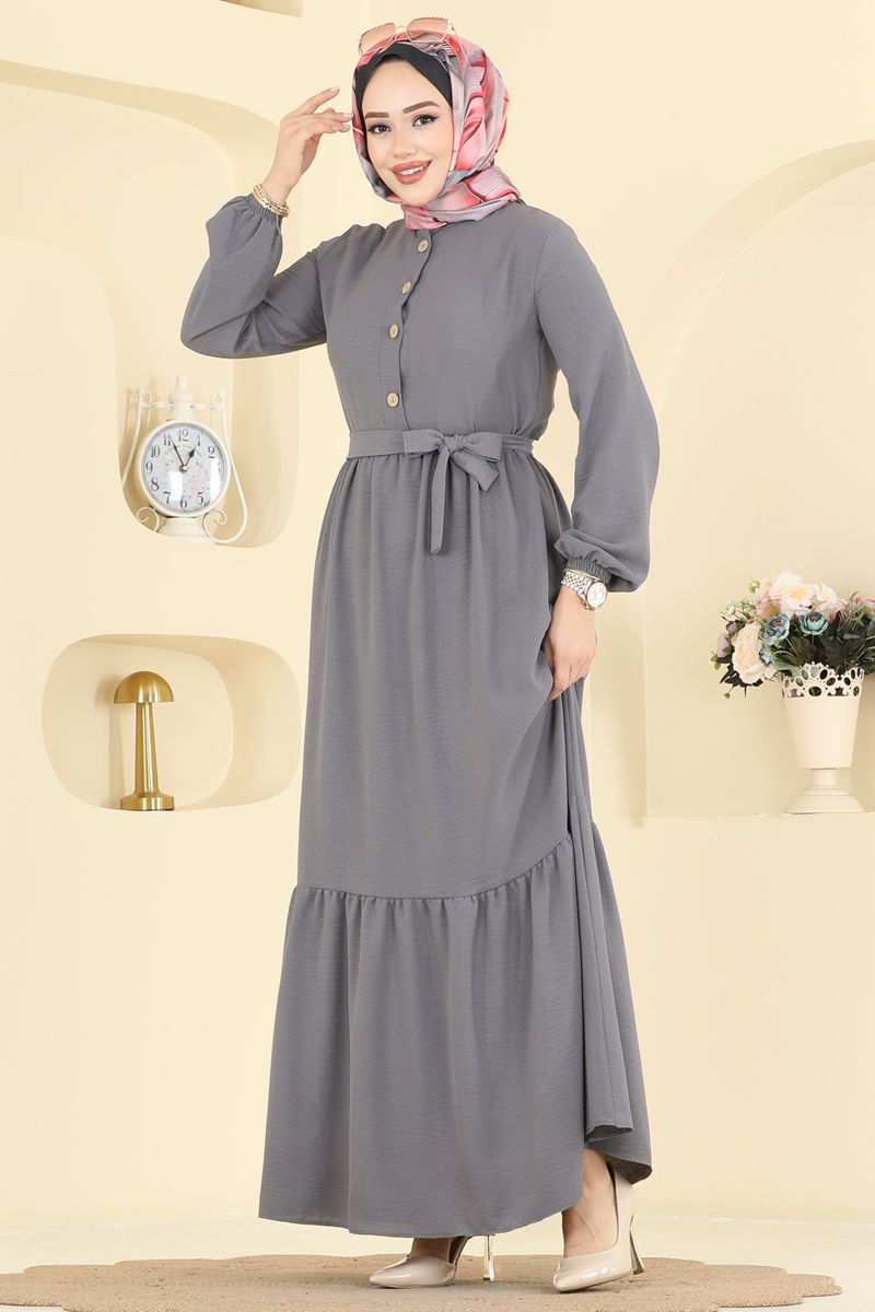 Bu aerobin kumaş kullanılarak üretilen, eteği katlı gri elbise tesettür stilinize uyum sağlar. Dört mevsim kullanabileceğiniz bu elbise, 30 derecelik hassas yıkamaya uygundur. Modern tasarımı hakim yaka ve yarım düğmeli ön detaylarla tamamlanmıştır. Astar içermeyen ve beli dikişli bu yapısı ile kullanım rahatlığı sağlar. Kemer, tarzınıza ek bir görsellik katarken, lastikli manşetler hem şık hem de fonksiyonel bir detaydır.