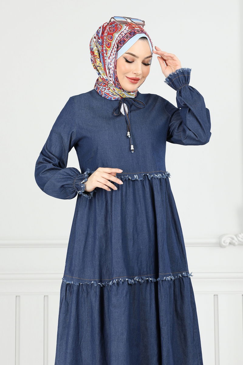 Elevate your style in every season with this chic Layered Skirt Denim Dress. Suitable for all-season use, this dress is easy to care for with its 30-degree gentle wash feature. The perfect blend of Tencel denim offers both comfort and elegance. Its V-neck design and unlined structure ensure a comfortable fit. With elasticated cuffs, this model is easy to slip on, offering convenience in wear. Dazzle in any setting!