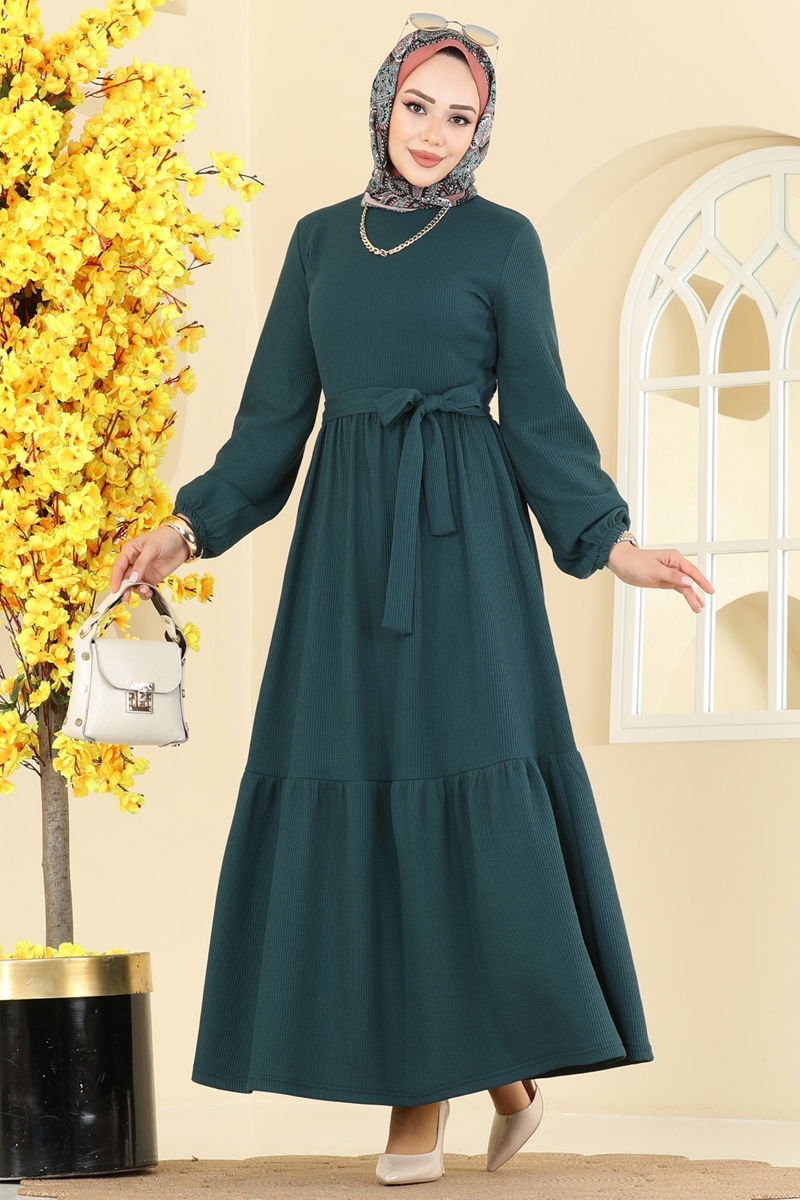Eteği Katlı Kuşaklı Elbise 4120PM271-MS Petrol