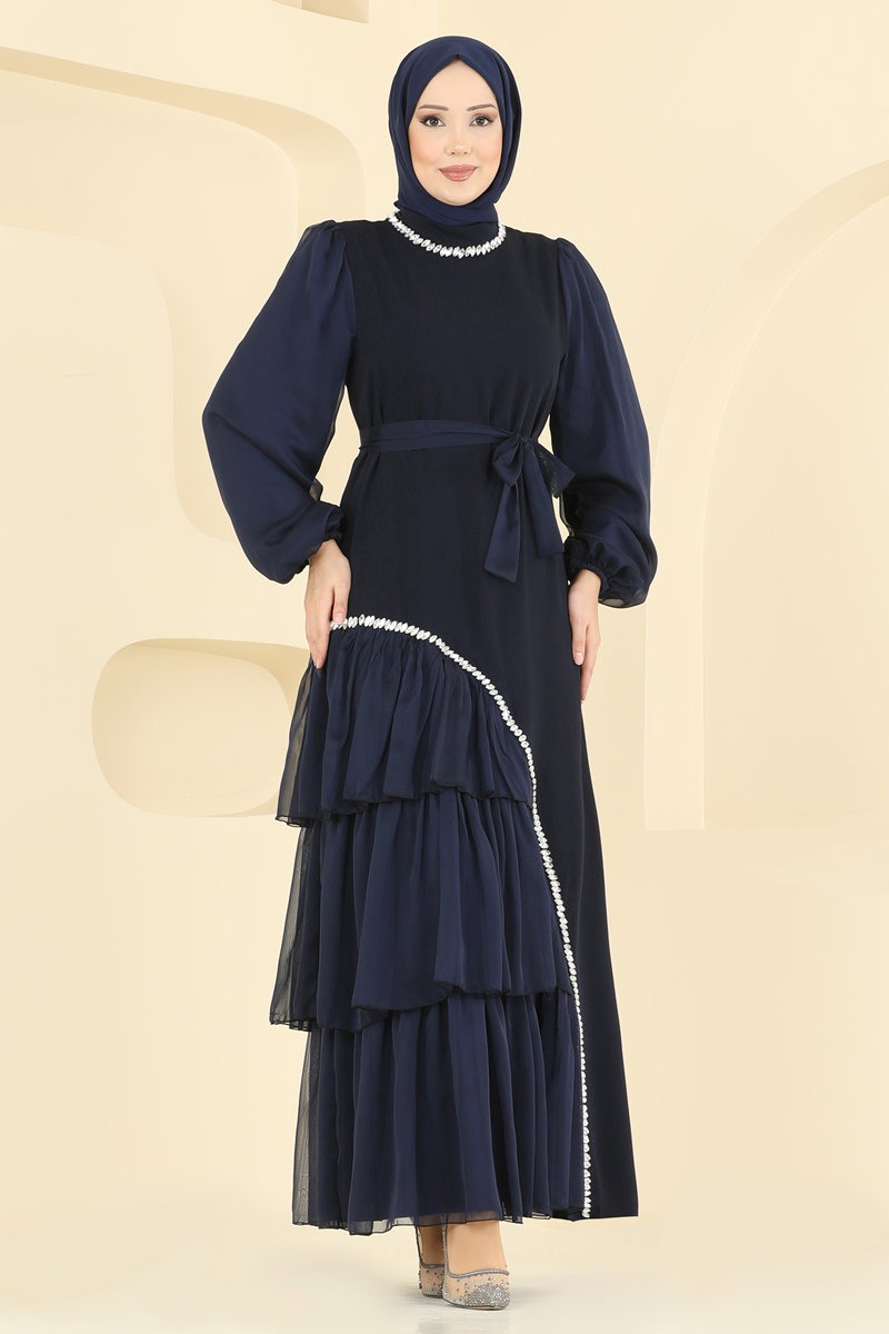 Lacivert Taş İşlemeli Katlı Abiye Elbise