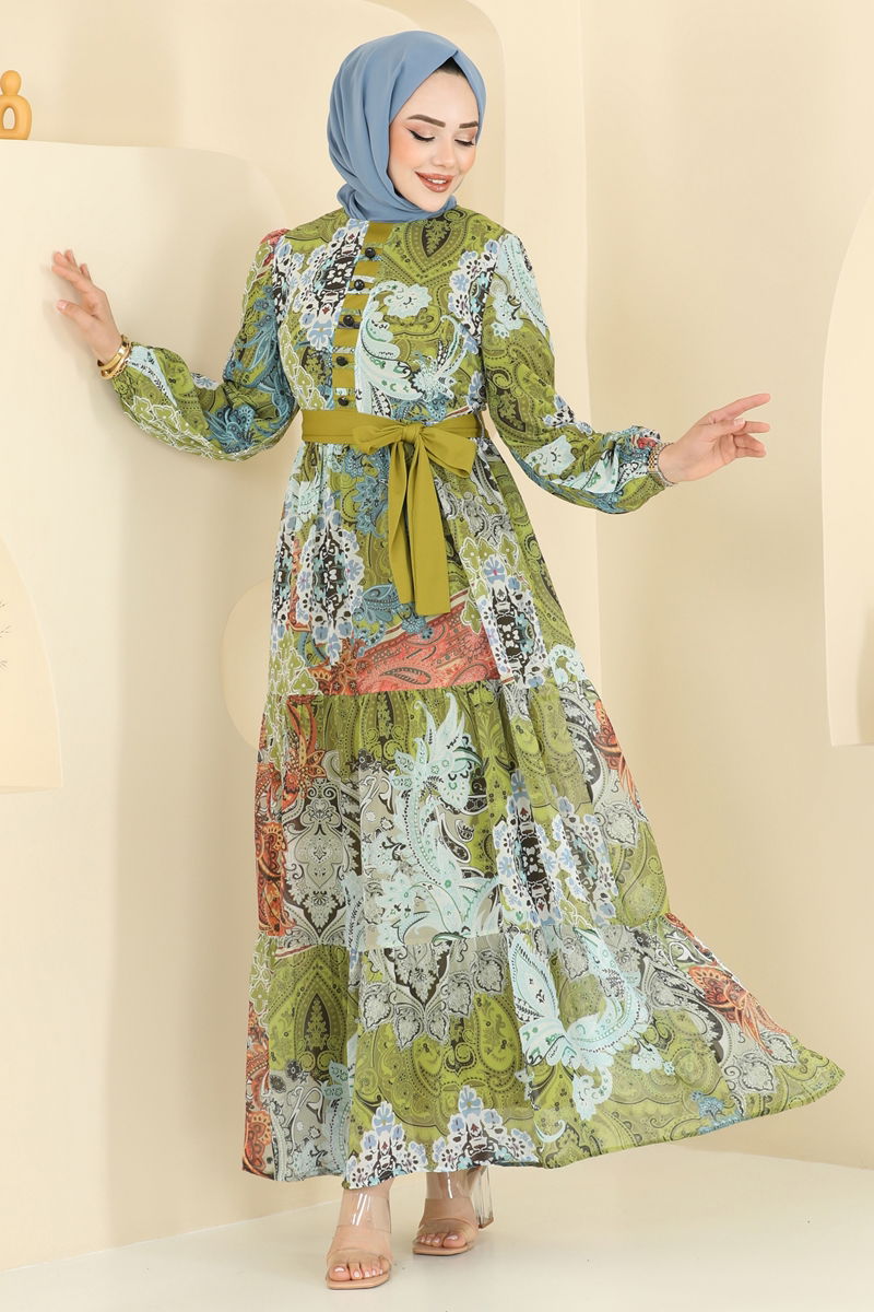 Etnik Desen Şifon Elbise 5297AL357-MS Yağ Yeşili