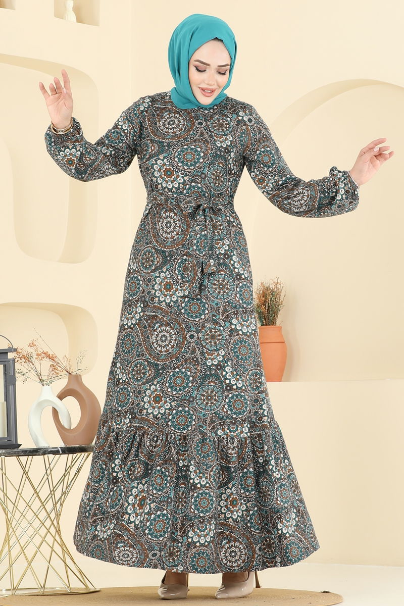 Etnik Desen Tesettür Elbise 4128PM271-MS Desen 1 Zümrüt
