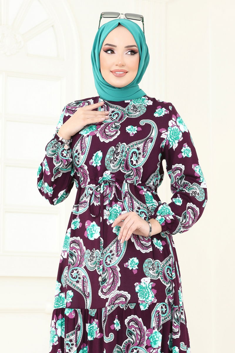 Etnik Desenli Viskon Elbise 823OZN1046-MS Mürdüm