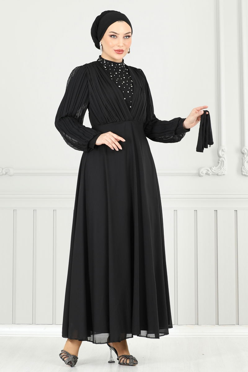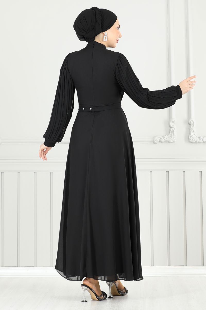 The Stone Detailed Chiffon Evening Gown combines elegance and style, making it an ideal choice for modest wear throughout the seasons. This gown should only be dry cleaned and is made from chiffon fabric. It features a mandarin collar design and is lined for comfort. The back zip makes it easy to wear, and it's adorned with intricate bead and stone details which catch the eye. It also comes with a belt, with stitched ends and an optional usage, adding an elegant touch. The product on the model is size 38.