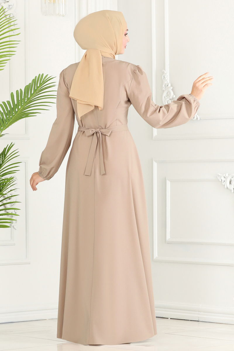 Elegant and modern, the Chain Belt Evening Dress is an ideal choice for a modest fashion statement that can be comfortably worn in all seasons. This dress stands out with its delicate nature and can be washed at 30 degrees, offering durability thanks to its crepe fabric. Featuring a bicycle neckline and a zipper at the back, it ensures practical use. The included belt is designed to prevent waving and can be optionally removed. The cuffs are elasticized, providing a comfortable fit. This unique design is perfect for enhancing your elegance on every special occasion.