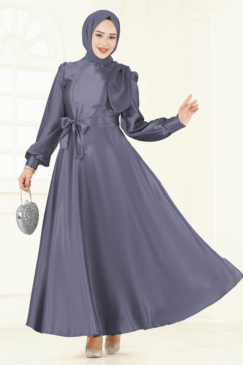 This elegant Belted Satin Evening Dress is specially designed for women who embrace the hijab fashion style. Suitable for use across all four seasons, this product is perfect for any special occasion. Made from high-quality satin fabric, the dress should only be dry cleaned. It features a zipper at the back for a graceful fit. The model is designed with a height of 165 cm, chest of 80 cm, waist of 68 cm, hips of 96 cm, and weighs 54 kg.