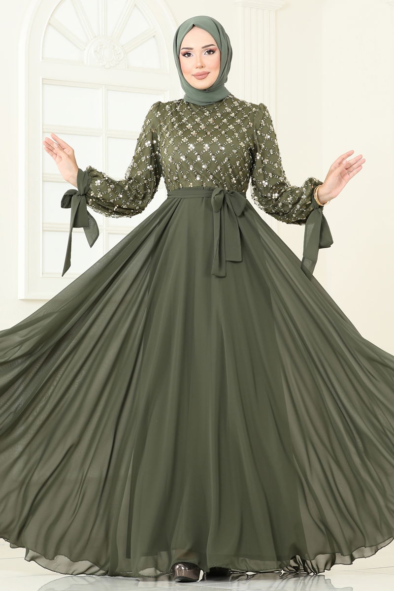 Elegant and eye-catching, the Beaded Chiffon Evening Dress is an ideal choice for those who embrace modest fashion. Suitable for all seasons, this dress should only be dry cleaned. Made from chiffon fabric, it is lined for added comfort. The back zippered design ensures easy wearability. The bike-style neck adds a modern touch, while the beaded details and lace-up cuffs enhance its elegance.