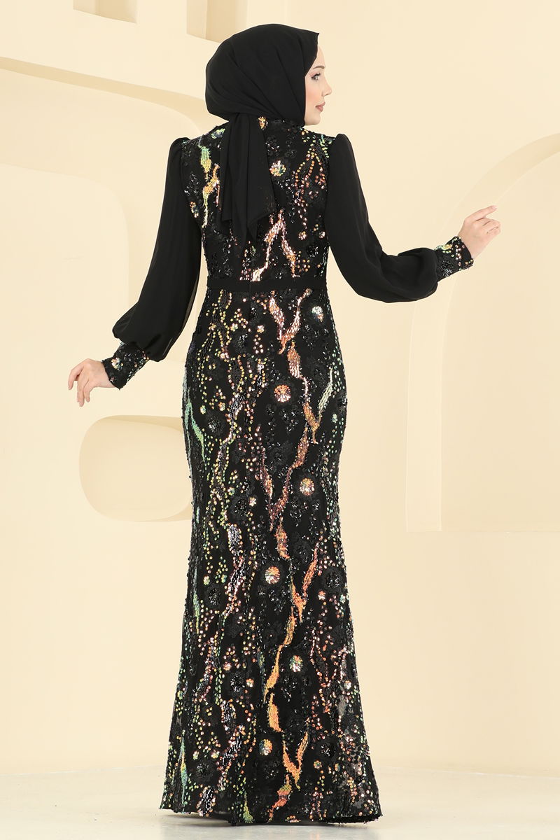 The Sequin Detail Evening Dress is an all-season compatible modest wear piece. Made from chiffon and sequins, this dress ensures an elegant and refined appearance. Only suitable for dry cleaning, it is lined and features a back zipper for easy wear. The bike neck design adds a modern twist, while built-in chest pads offer extra comfort. The sequin details provide a sophisticated touch, although their colors may vary slightly, contributing to the uniqueness of each dress. It also has a sewn-in belt at the waist.