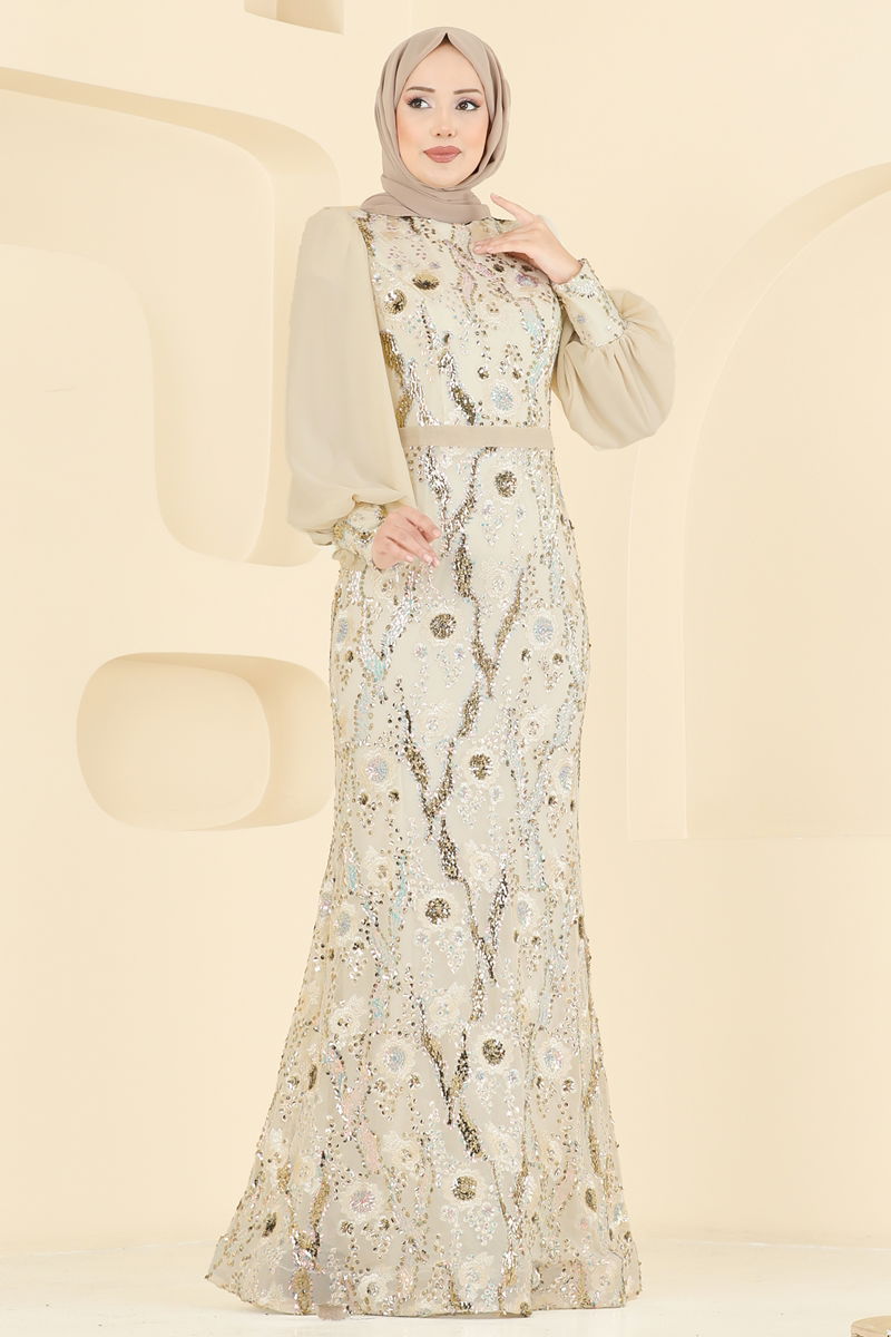 The Sequin Detail Evening Dress is an all-season compatible modest wear piece. Made from chiffon and sequins, this dress ensures an elegant and refined appearance. Only suitable for dry cleaning, it is lined and features a back zipper for easy wear. The bike neck design adds a modern twist, while built-in chest pads offer extra comfort. The sequin details provide a sophisticated touch, although their colors may vary slightly, contributing to the uniqueness of each dress. It also has a sewn-in belt at the waist.