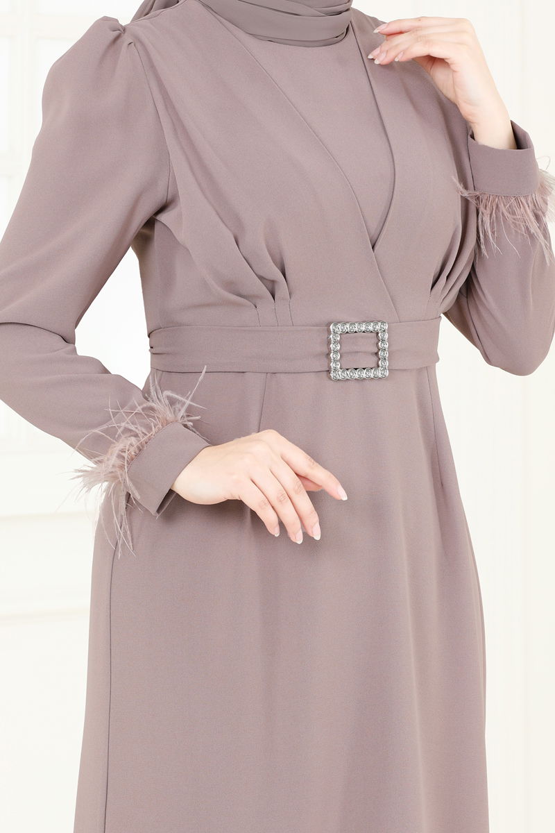 This elegant Belted Gem Pencil Evening Dress, designed as a modest model, ensures your elegance throughout all seasons. Made from crepe fabric and only suitable for dry cleaning, the dress offers a comfortable fit with its collarless design and back zipper. It features chic ostrich feathers and includes a belt that is eye-catching with two fixed ends and an unstitched middle, optional for removal.