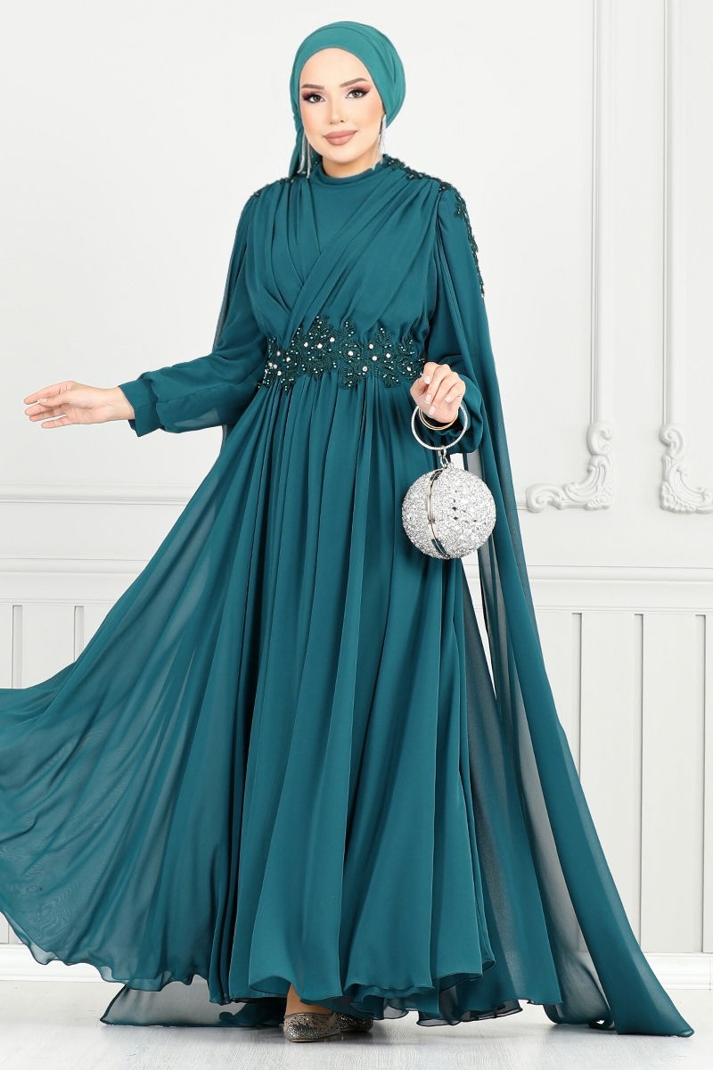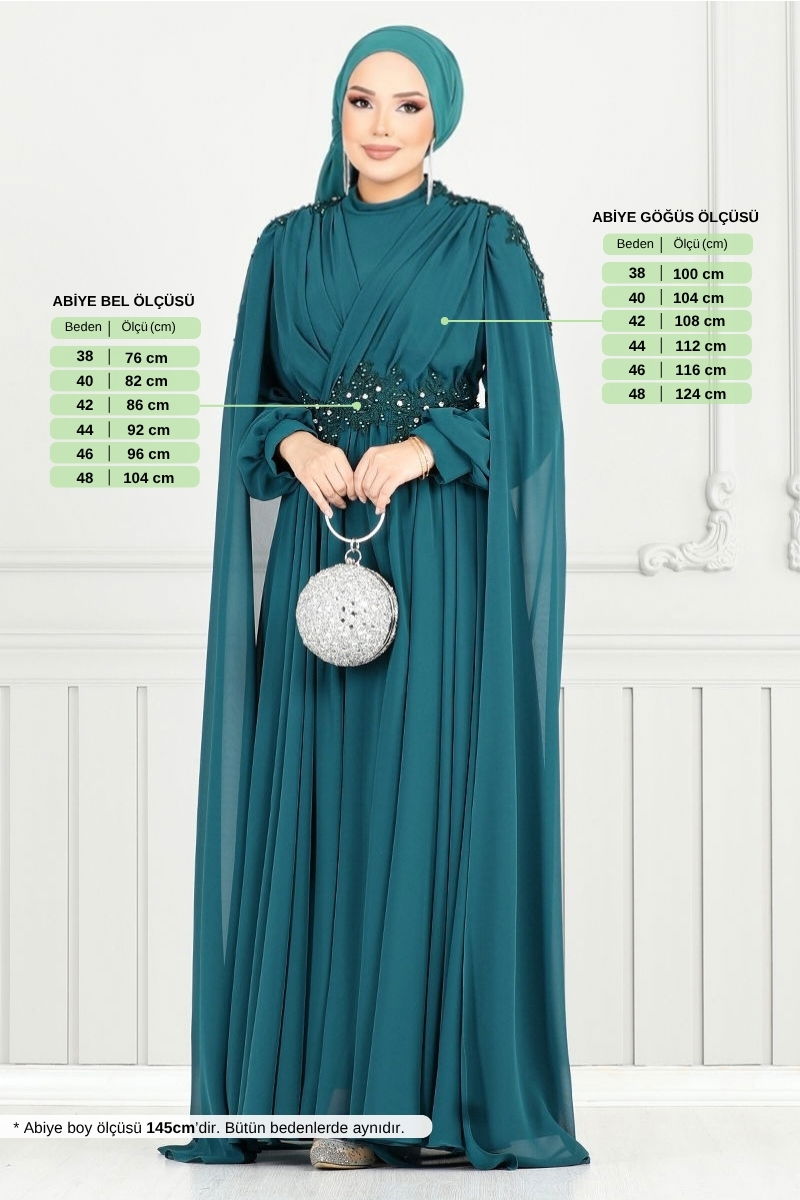 The Draped Front Modest Evening Dress is a stylish choice that can be worn in any season. Made from chiffon, this dress offers both comfort and elegance with its lined design and mandarin collar. It features a zipper at the back, making it easy to wear. Embellished with lace and bead details, this evening dress will ensure you look stunning on your special occasions. Dry cleaning is recommended.