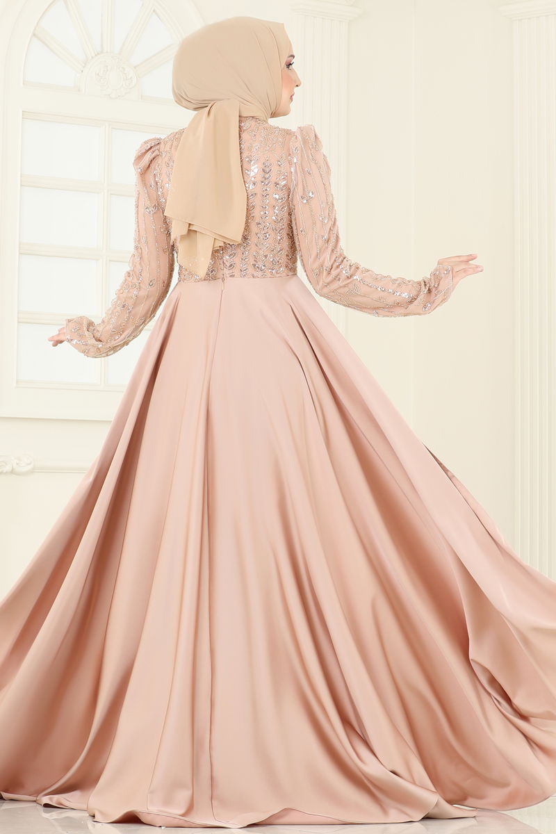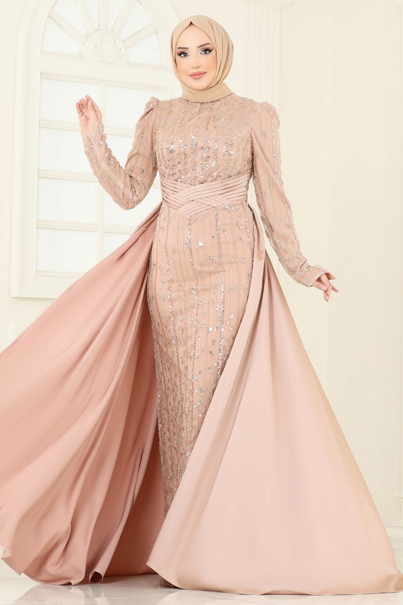 SUAL Embroidered Cape Evening Dress offers both elegance and comfort in a modest design. Suitable for all seasons, this special design should only be dry cleaned. Made from beaded satin fabric, it is lined and features a stand-up collar that catches the eye. This zipper-backed dress is displayed on a model with measurements of 165 cm height, 80 cm bust, 68 cm waist, and 96 cm hips. The dress has sewn sequin details, bead details are fixed with a setting method. Features like chiffon cape detail and chest pads make this product an elegant choice.